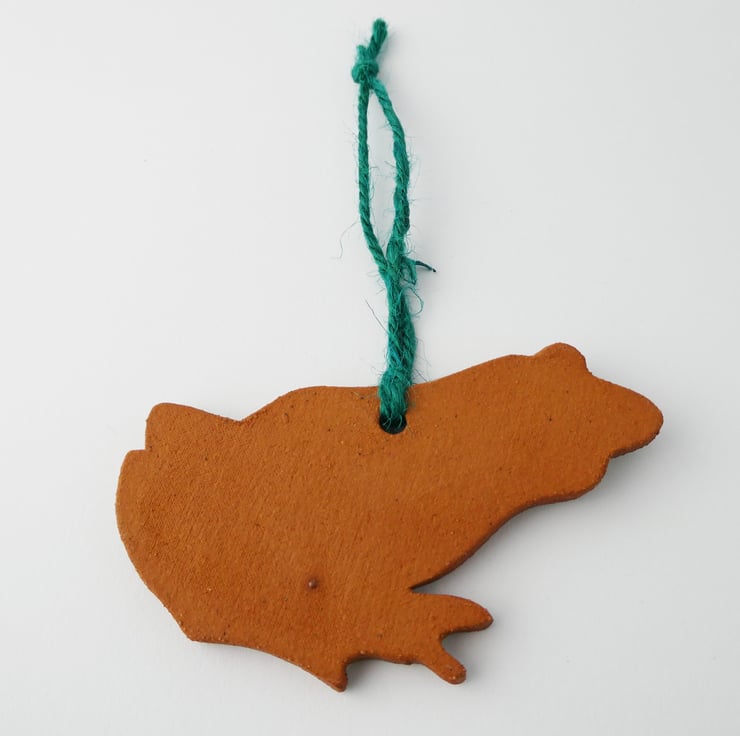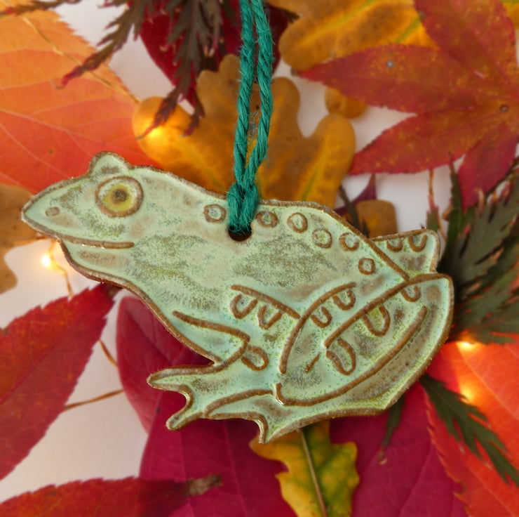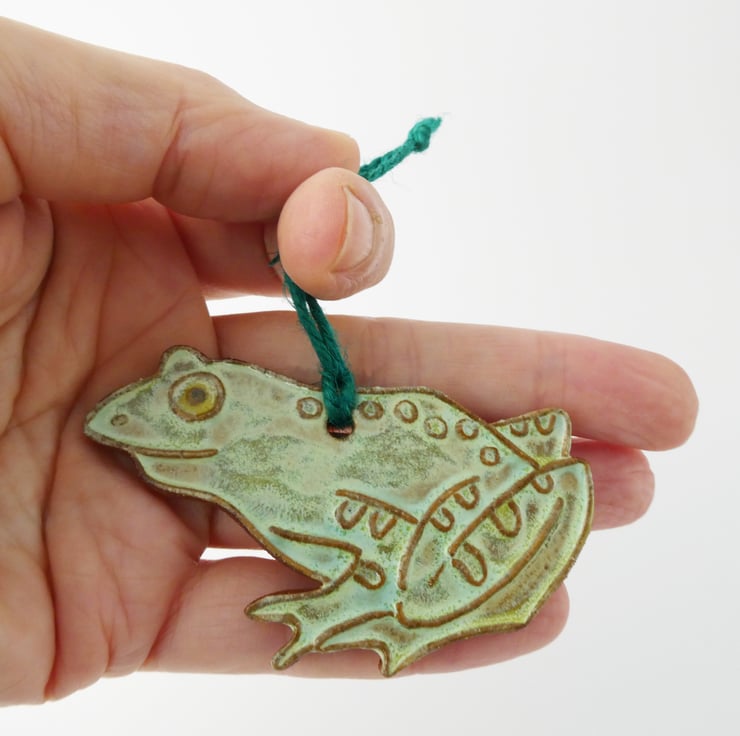 Frog made from terracotta clay with a relief print and finished in green and yellow glaze. It hangs from a green sisal string.