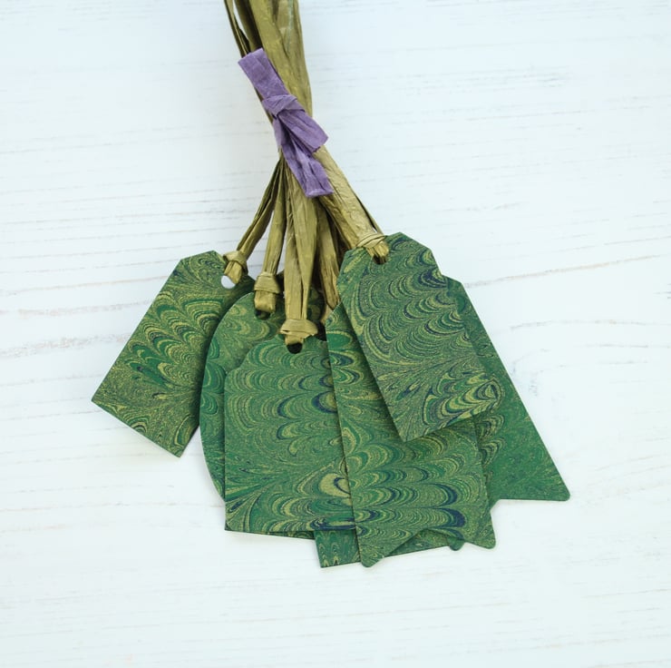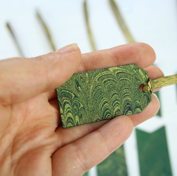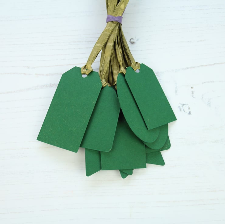 The backs of all these tags are green. Paint pens (such as the Posca brand) work brilliantly. The tags are made with 250gsm card and the gold paper raffia is approximately 120mm long