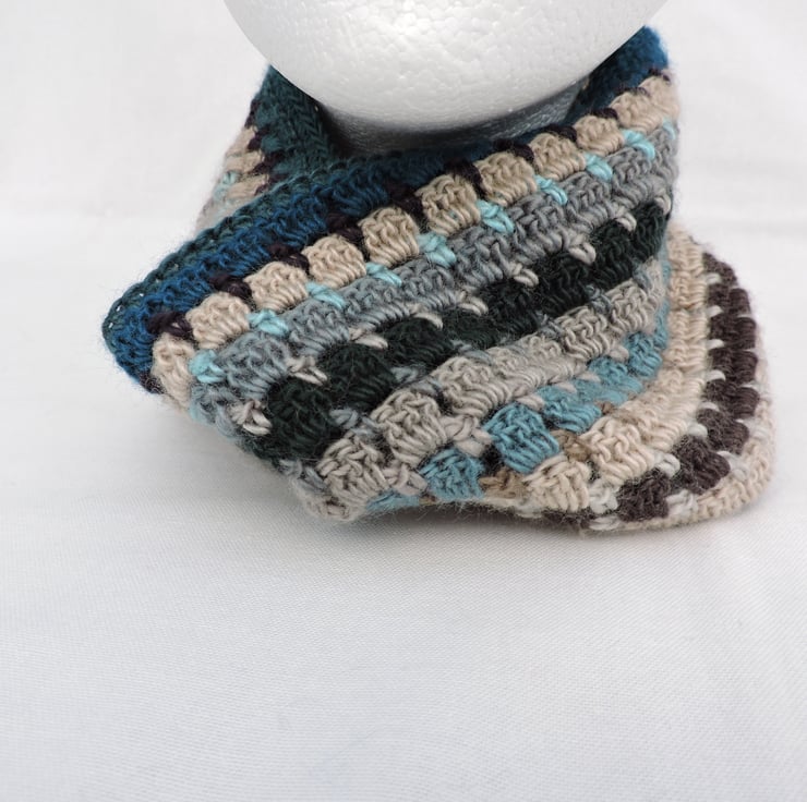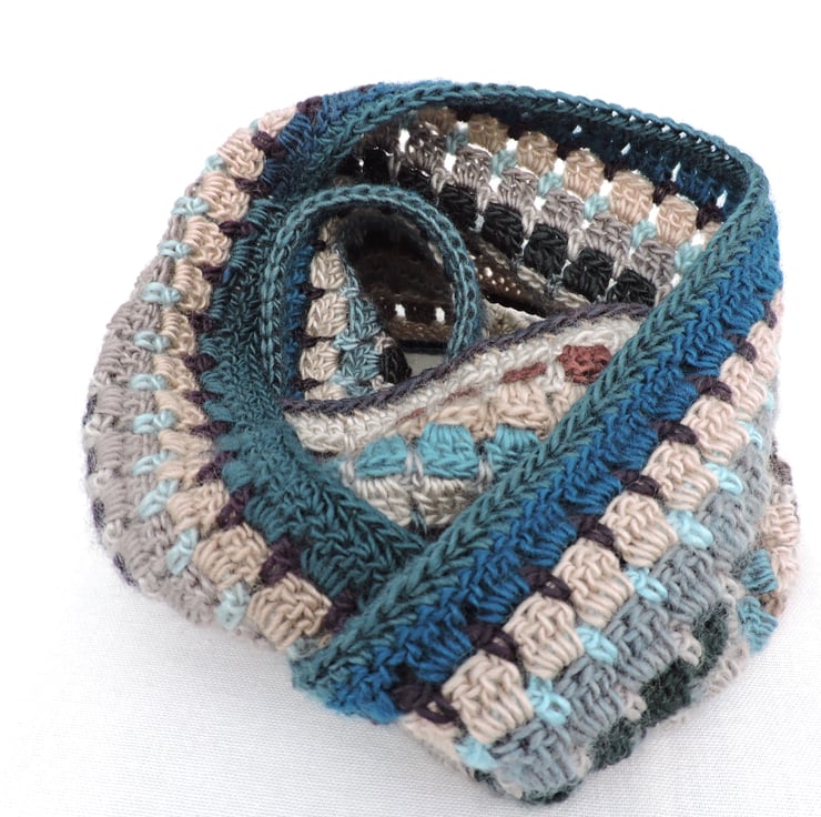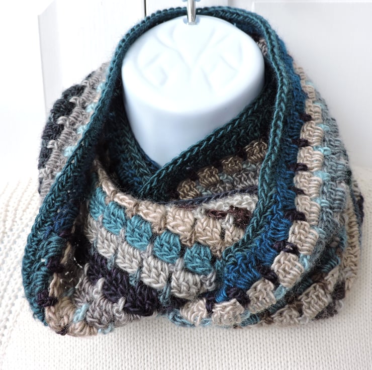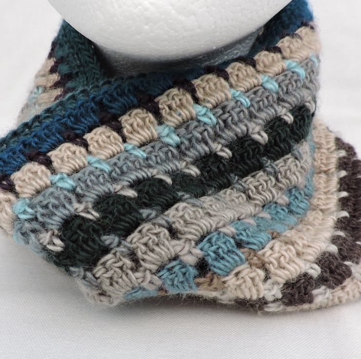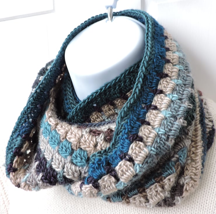 This cosy infinity scarf has been crocheted in an acrylic and wool double knit yarn. Graduating colours of sapphire blue, teal, grey, aqua, cream, turquoise and brown. A lovely winter warmer, wear it long or wrapped twice around your neck to keep you snug and warm. .