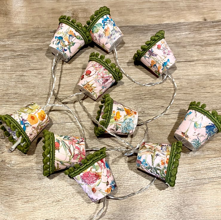 These mini lampshades are perfect to drape along a mantlepiece or shelf, around the head of a bed, or strung across a mirror or picture frame.