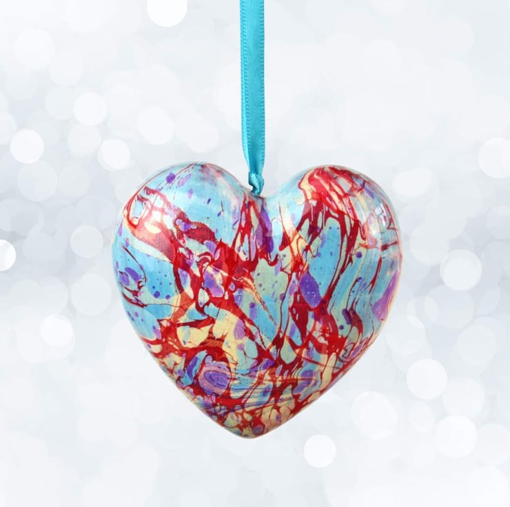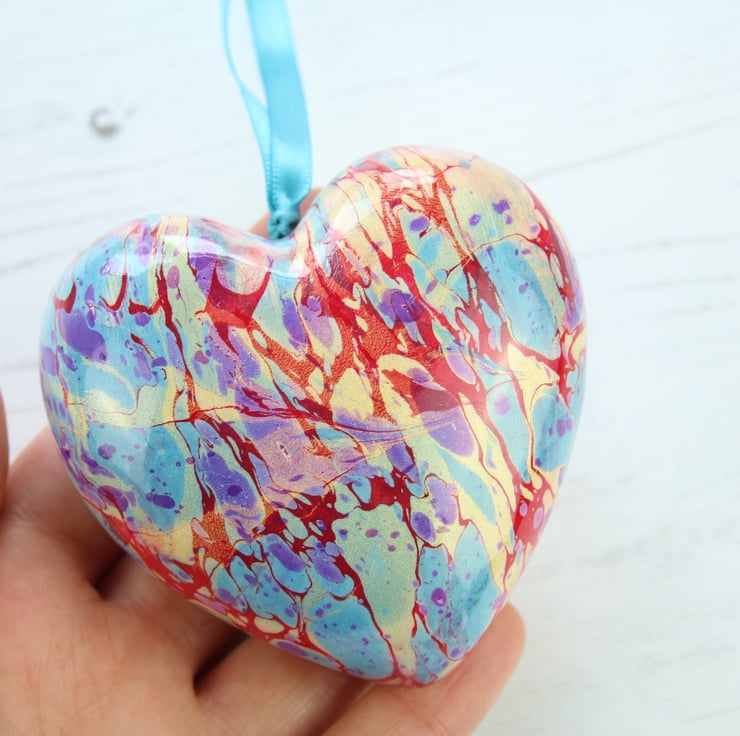 A beautiful and bright colour combination on this marbled ceramic heart with sky blue, red, gold and purple.