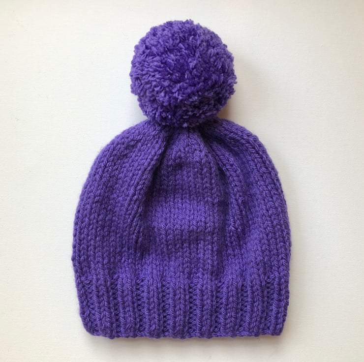 This bobble hat is hand knitted in ultra violet chunky acrylic yarn with a large ultra violet chunky and squishy pom pom sewn on.
