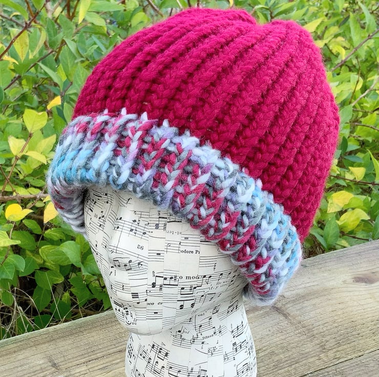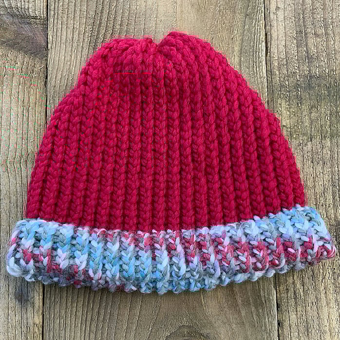 It has been hand knitted on a loom, with a soft chunky yarn.