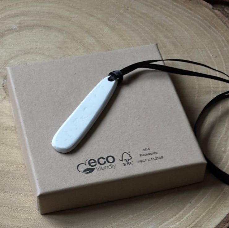 Delivered in gift box made from FSC®-certified cardboard and water-based glue. Presented on Jewellery box insert made from tall oil, a by-product of paper production. Sustainable gifts, complete with short bio and gift bag.