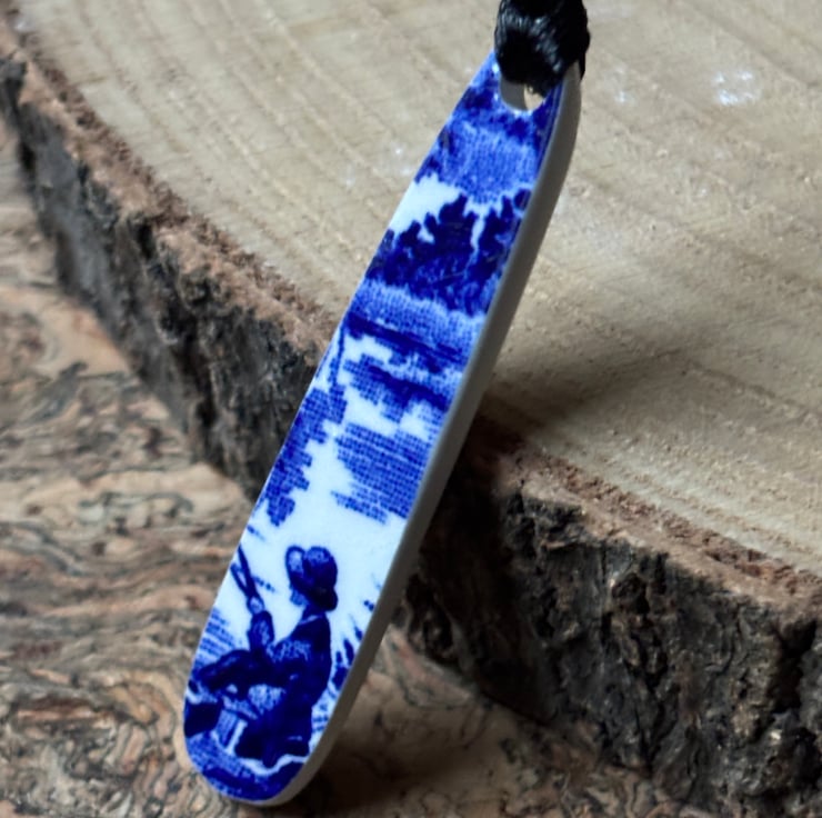 This little decoration is made from the centre part of the plate, deep rich blue. Front glazed pattern in good condition, back has been sanded and sealed With Eco Friendly sealant.