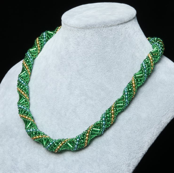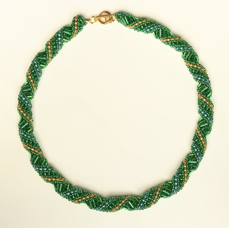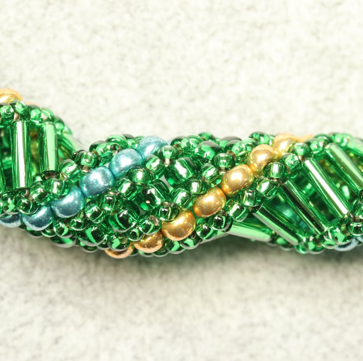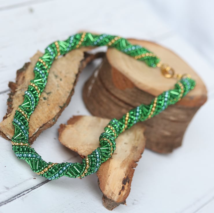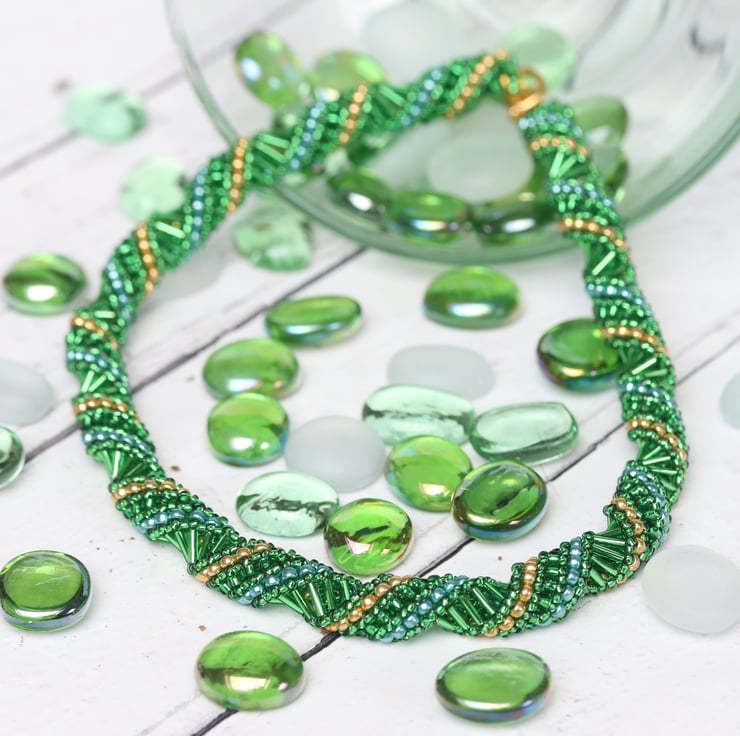 This pretty beadwoven necklace is made from Shiny silver-lined green bugle and seed beads. Thin lines of beads in blue/green and in gold provide an accent. The design is fairly lightweight, despite its chunky appearance, because the necklace is hollow inside. I have stitched the necklace using a pattern called a Russian Spiral. I use seed beads of high quality: Miyuki and Toho. The bugle beads give the necklace flexibility. I have used 10lb Fireline braided beading thread to make the piece as robust as possible. The necklace is finished with a gold plated toggle clasp but I could change this to a different type of clasp at your request. This may cost a little extra, so please contact me before purchasing if you would like this option.