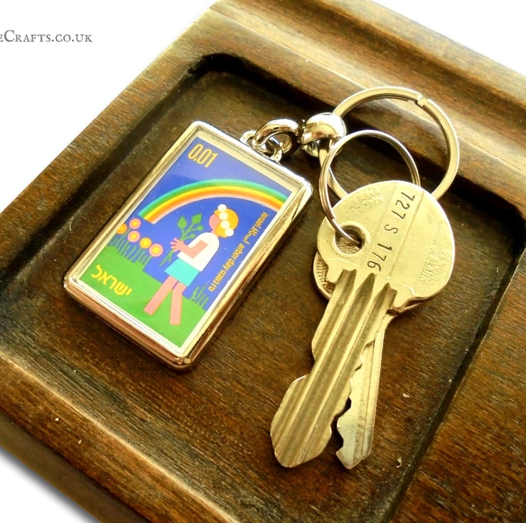 Made by upcycling a real postage stamp, this joyful little keyring features a wonderfully retro illustration of a child beneath a.colourful rainbow. Full of character & charm, it is a lovely small gift idea (also a nice compact letterbox-friendly size for posting)!