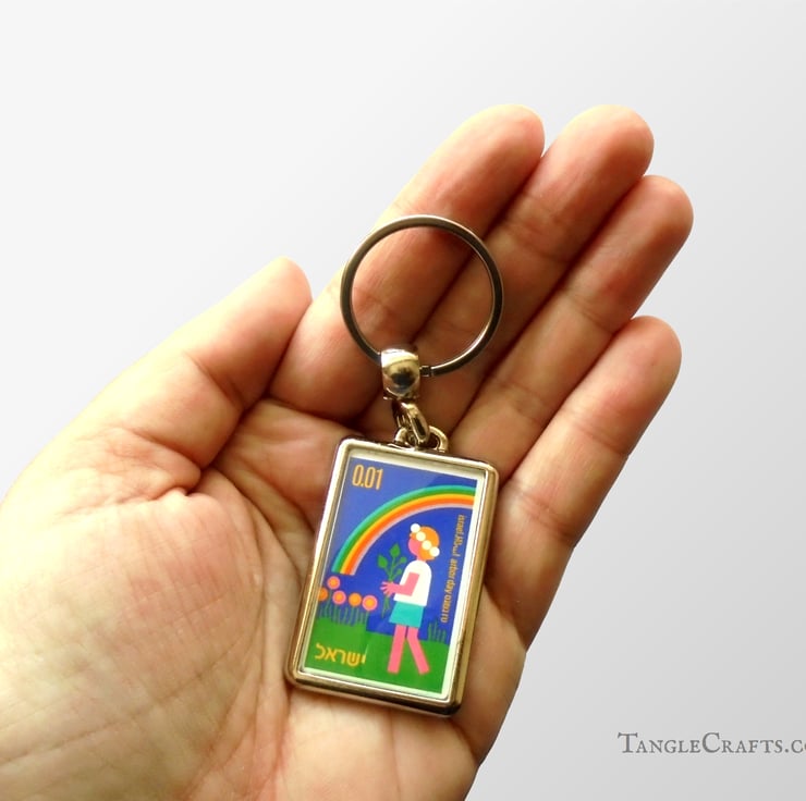 - A genuine postage stamp is trimmed & hand-pressed into the silvertone metal keyring casing