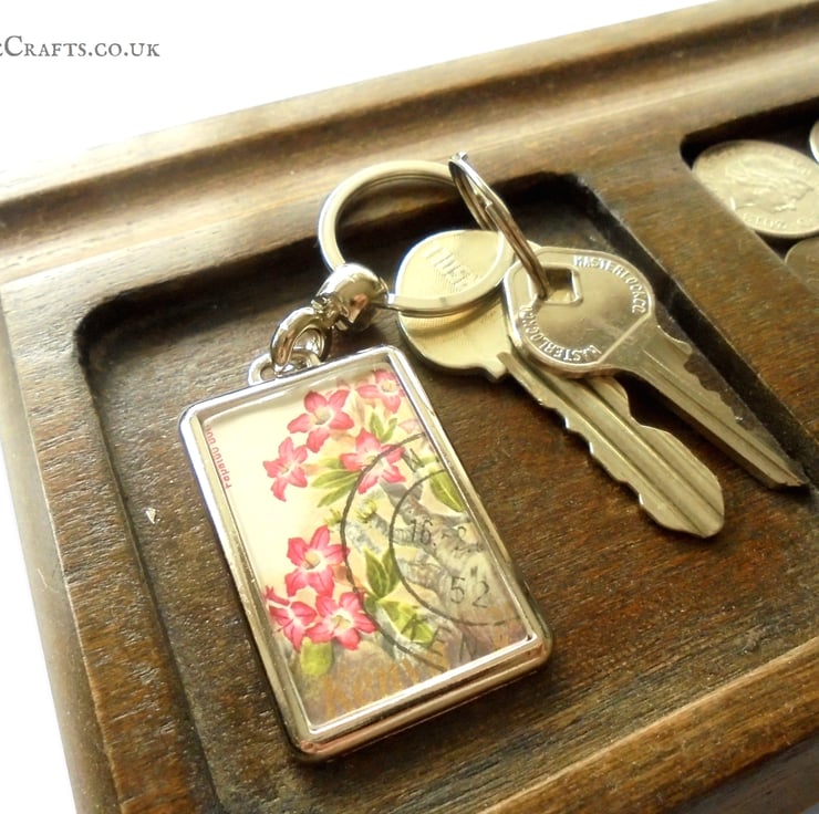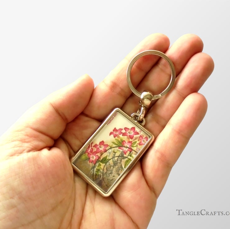 - A genuine used postage stamp is trimmed & hand-pressed into the silvertone metal keyring casing