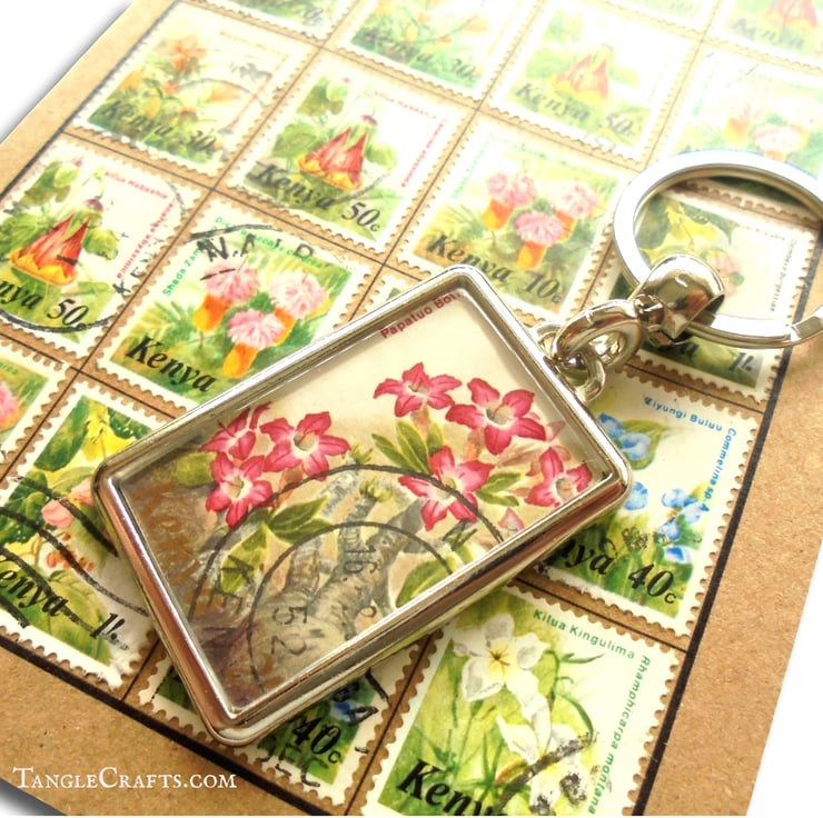 Made by upcycling a real postage stamp, this unique keyring features a lovely illustration of a pretty-but-poisonous succulent. Full of character & history, it is a great small gift idea (also a nice compact letterbox-friendly size for posting)! Full details below: