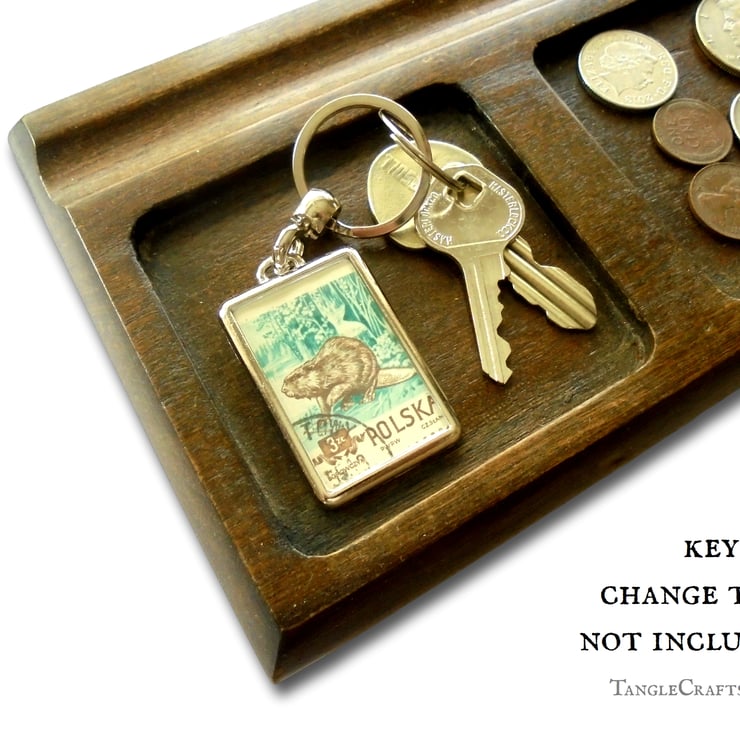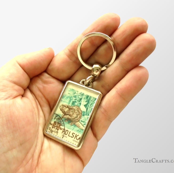 Made by upcycling a genuine old postage stamp, this one of a kind keyring features a lovely illustration of a beaver by the riverside. Full of character & history, it is a great small gift idea for animal lovers (also a nice compact letterbox-friendly size for posting)! Full details below: