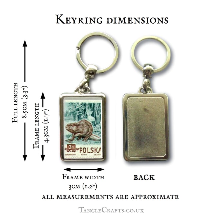 - The keyring 'frame' measures approx. 2.9 x 4.2cm. The full length including split ring measures approx. 8.5cm