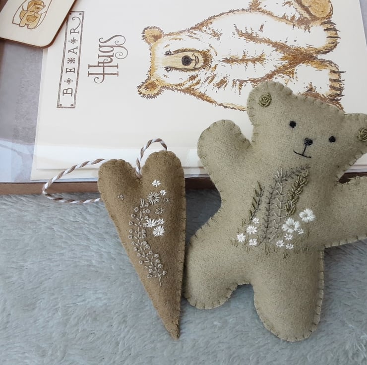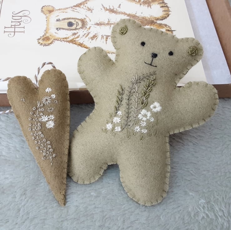 I've been making notes of new ideas for Bearlescent for quite some time and have wanted to make some smaller gifts without losing the quality or overall look of Bearlescent. Recently one of my lovely bear customers lost a loved one and I pondered on what I could send her through the post with a sympathy card. I attached a 3cm little wooden bear and the idea literally came to me at that time. I scribbled some notes and and finally decided on a simple shaped embroidered bear that could fit through a letterbox. I wanted to add more details and experimented with various ideas before eventually deciding on a short verse and hand made card then lastly added the little embroidered heart. Being careful not to overfill the little bear I managed to make my first one that could fit in a 2cm deep postal box.