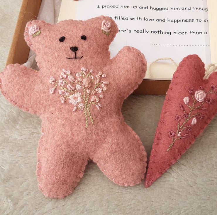 A unique design wool felt bear, decorated with hand embroidery. Lightly stuffed so he can fit into his handmade paper sleeve and squeeze through a letterbox.