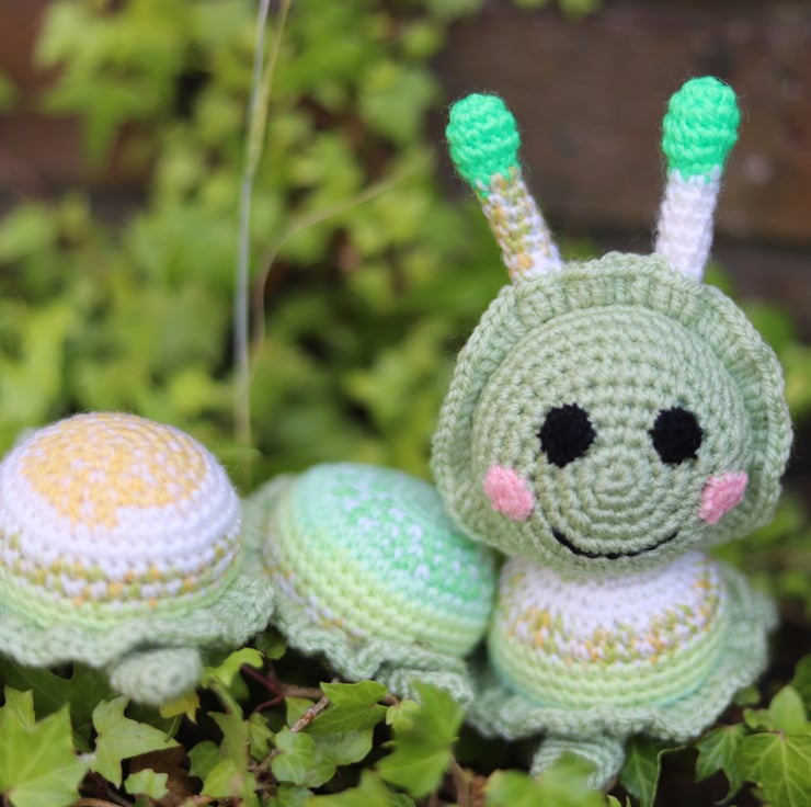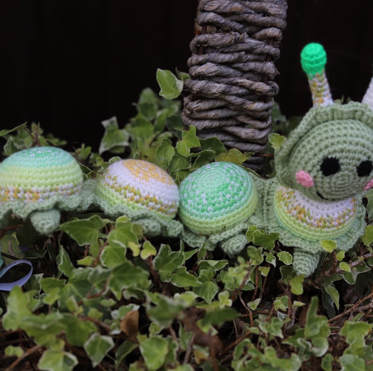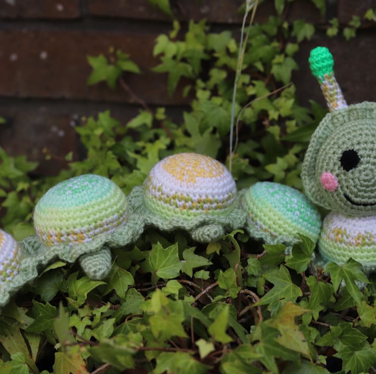 Handmade amugurumi green/yellow soft toy caterpillar. Aprox 12 inches long. This item is ready for immediate dispatch. Other colour combinations can be made to order. UKCA tested
