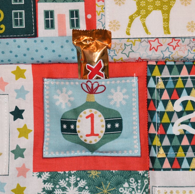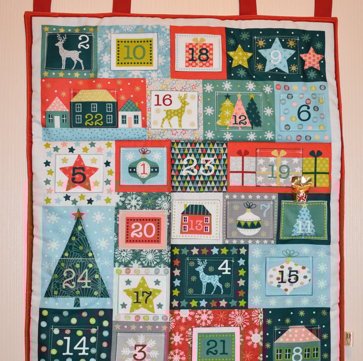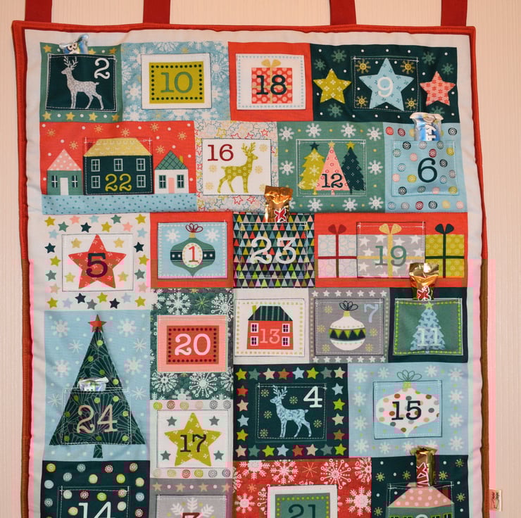 Why not countdown to Christmas with a reusable Advent Calendar, it can be filled with chocolates or small items of your choice. Each pocket is approx 3ins (7.5cm) wide by 2.5ins (6cm) tall, the actual panels measure approx 25.5ins (65cm) tall plus hanging loops by 31.5ins (54cm) wide.