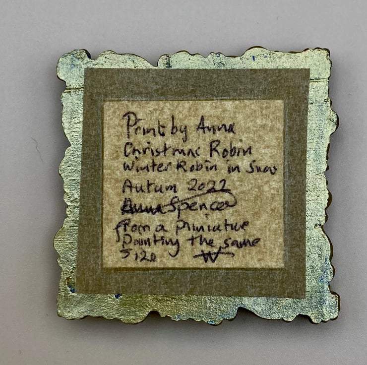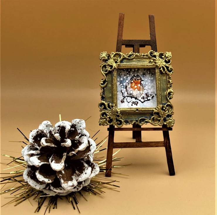 This is a tiny framed and signed PRINT of a Christmas Robin on a snowy branch. The whole picture is 'dolls house' scale (about the size of a large postage stamp). The print is taken from my original miniature painting of the same size, This little winter bird would make a charming gift or heritage Christmas decoration. Finishing by hand makes each little plaster frame very slightly different from another. I've added a touch of glitter to the gold acrylic frame to give it a little extra Christmas sparkle.