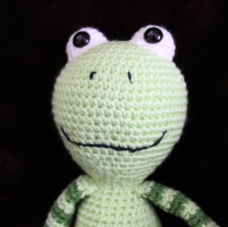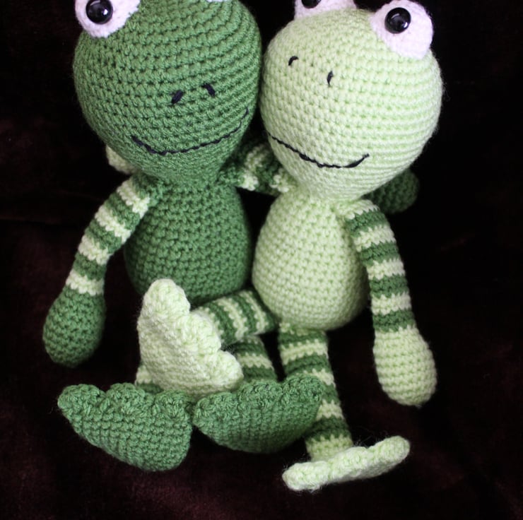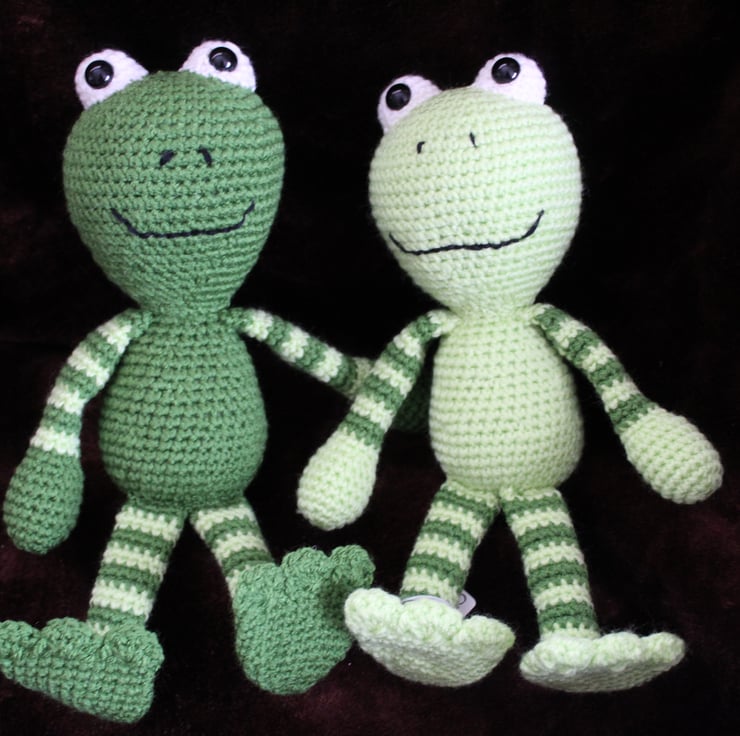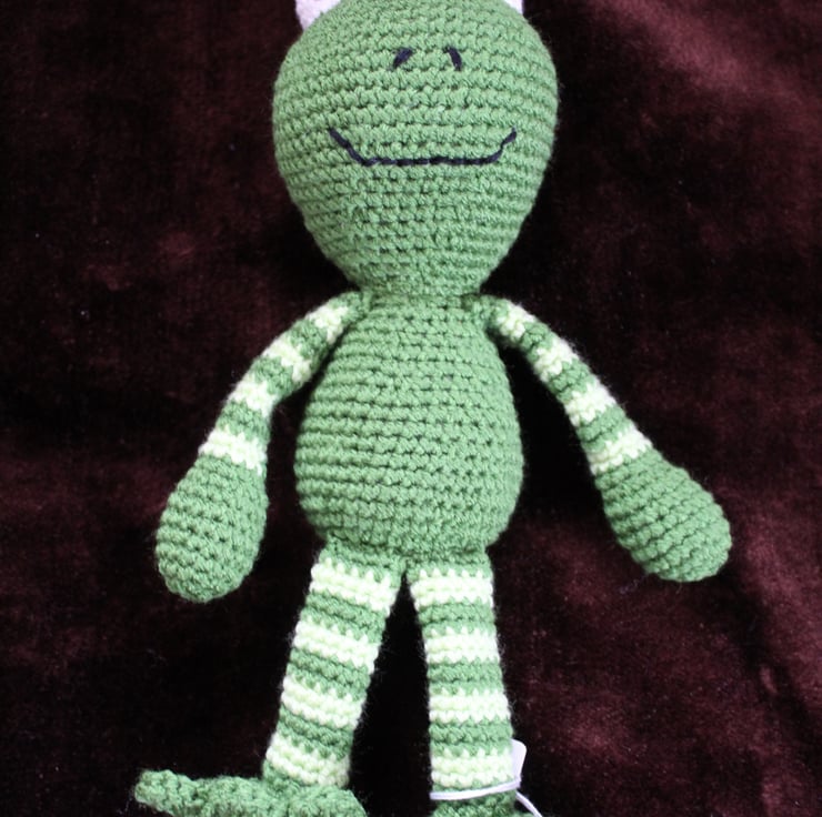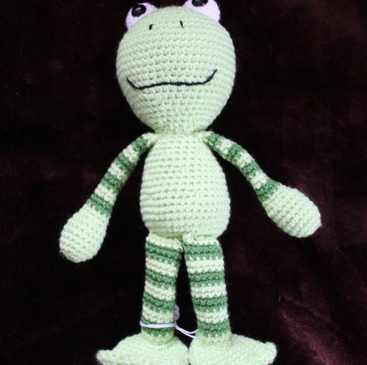 Handmade amigurumi soft toy frog. 18 cm sitting, 26cm tall. UKCA tested. This little chap is ready for immediate dispatch. Other colours available on request.