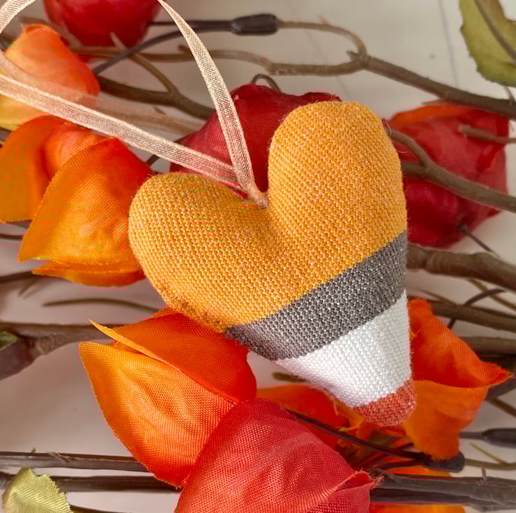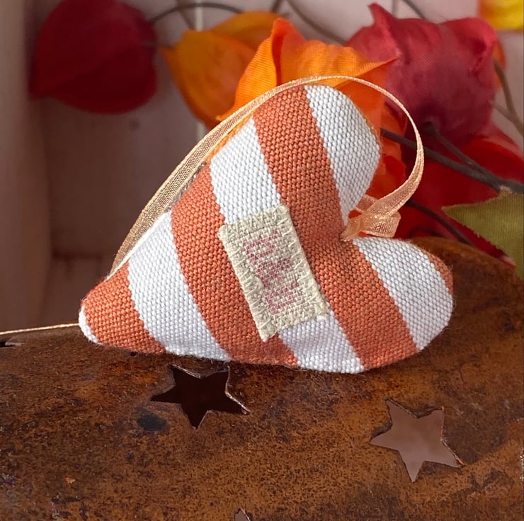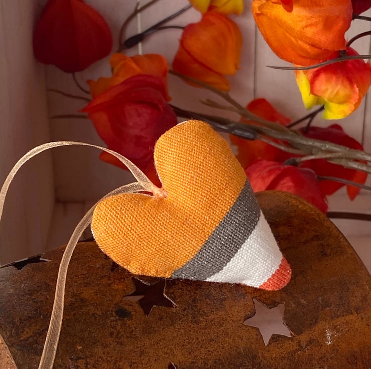 Celebrate the change of season with a mini heart that embodies the rich hues of autumn. The front is a warm mix of sienna orange, khaki, white and brighter orange stripes, and the reverse side is rusty orange and white stripes. Filled with toy-grade stuffing and finished with pale orange chiffon ribbon ties.