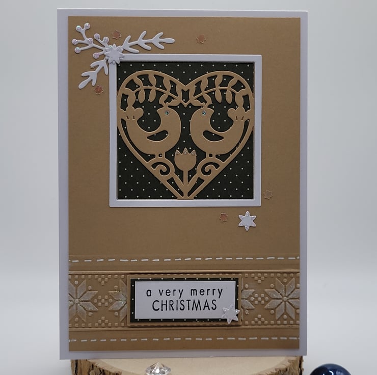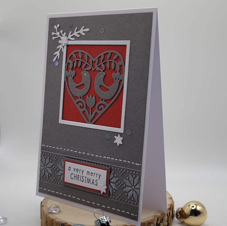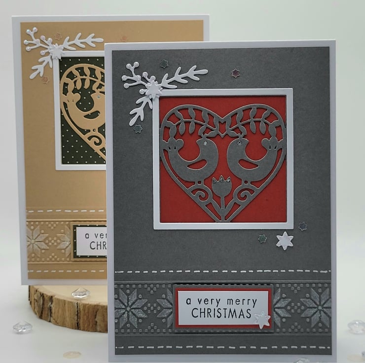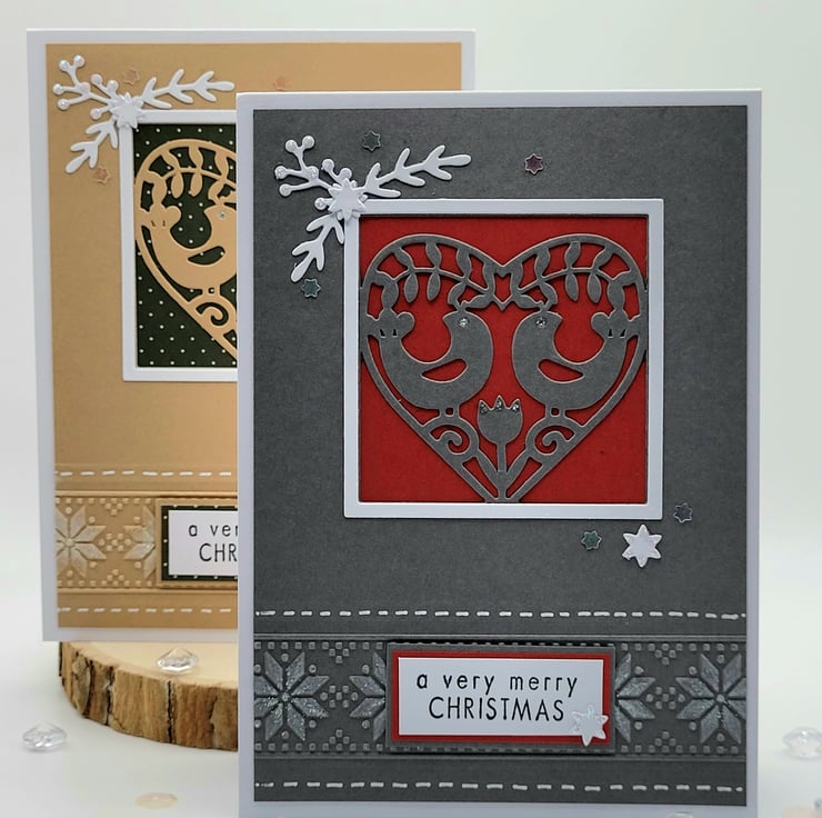 Each card has a window die cut in the front and a die cut nordic birds and heart design with a white frame around the windows. Some small branches and berries die cut in white and 5 tiny irridescent stars. There are also 2 white die cut star for added impact. The bottom of each card has an embossed border of nordic snow flakes edged with hand-drawn faux stitches and a hand stamped sentiment "A VERY MERRY CHRISTMAS" in a simple font. Subtle sparkle on the snowflakes has been added using non-shedding glimmer paste.