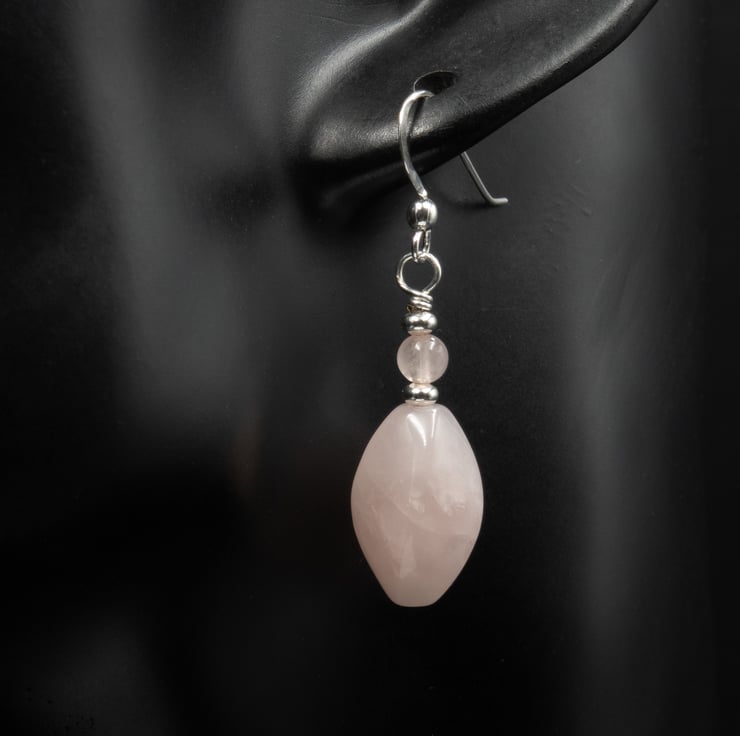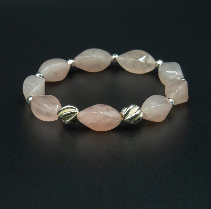 Pale pink rose quartz 9 x 16mm twisted barrel drops and 4mm rounds are mixed with small silver plated spacers .