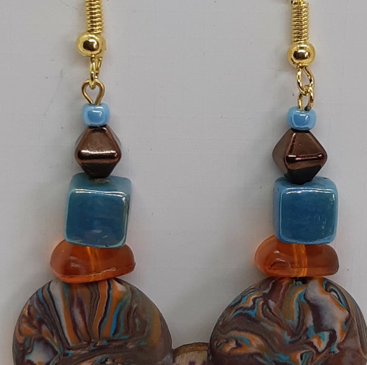 A colourful pair of polymer clay dangly earrings.
