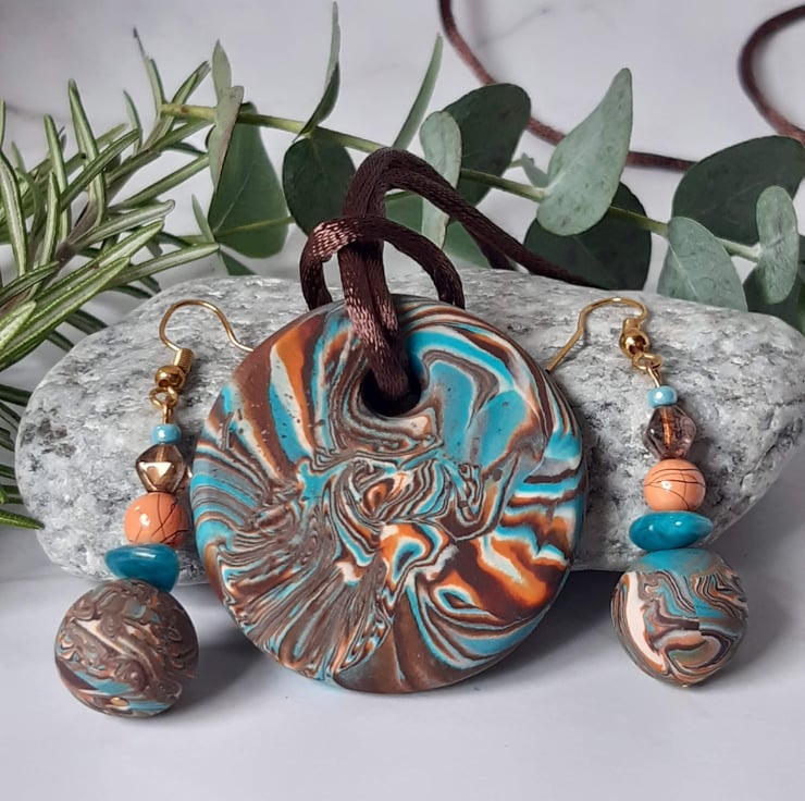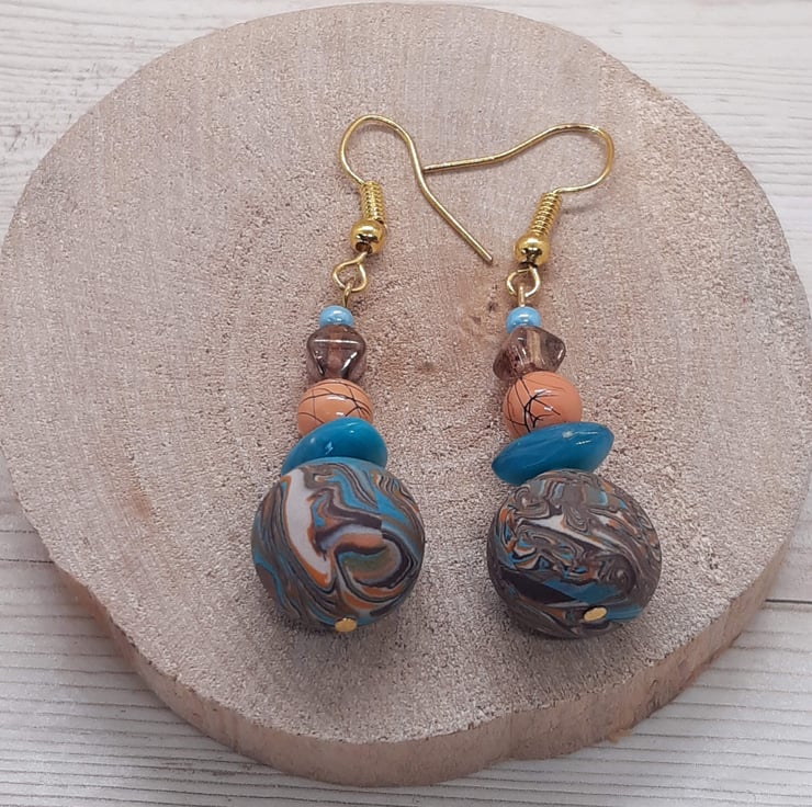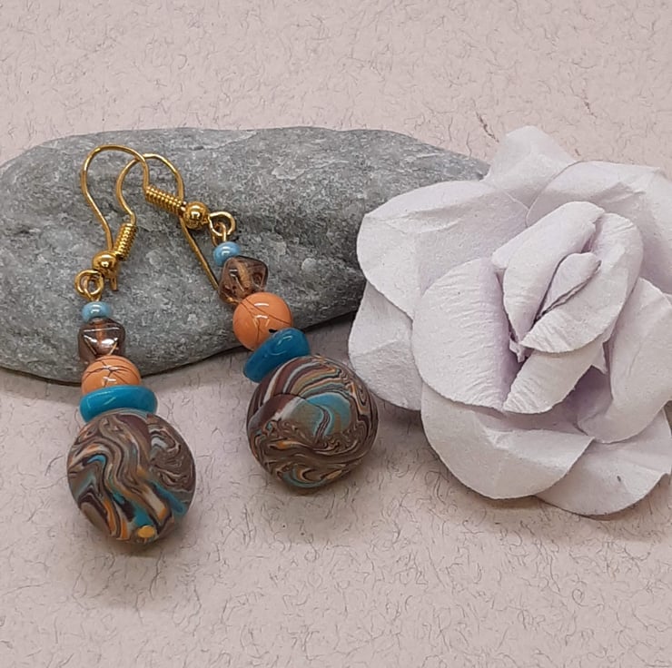 The handmade polymer clay bead measures 13.6mm with a turquoise triangular spacer, 6mm pastel orange round and small amber coloured hexagonal to complete the look.
