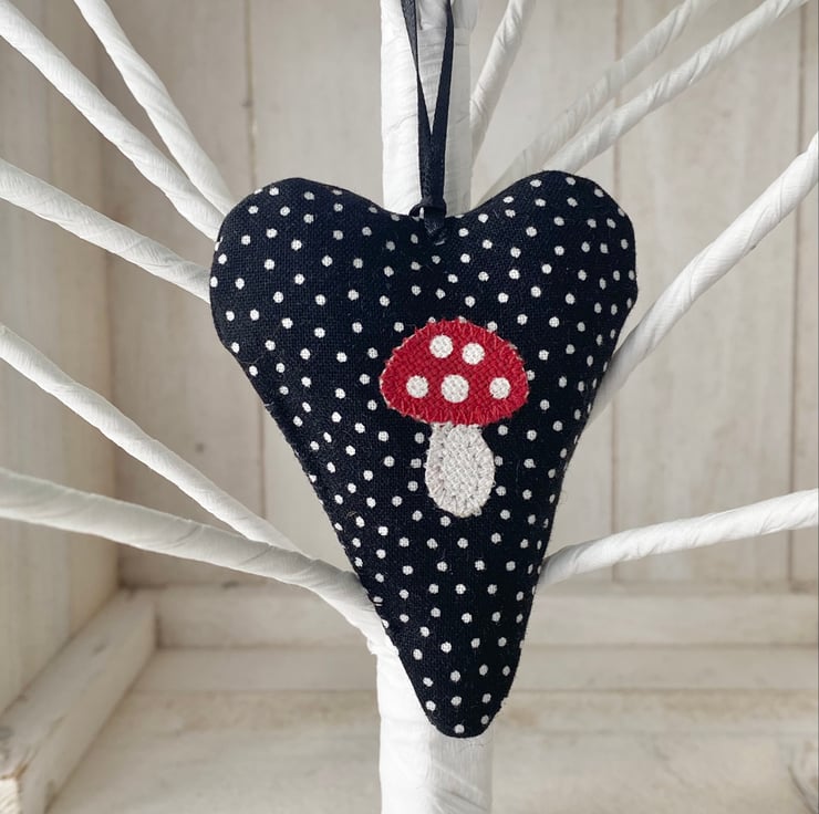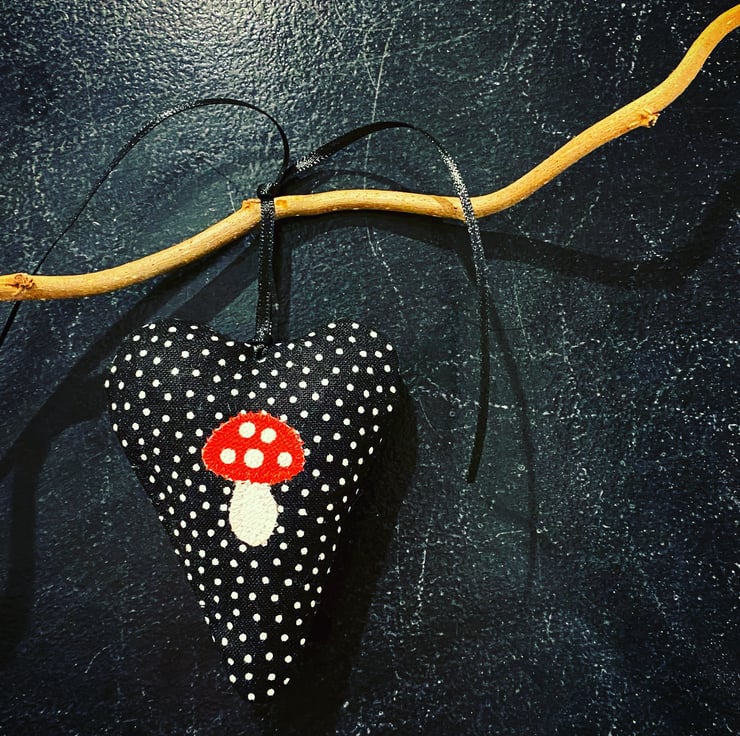 Celebrate the change of season and/or the annual spooky season with a dotty toadstool heart - this one is in black and white polka dots with a red-spotted toadstool on the front. It is generously filled with locally grown lavender and is finished with narrow black ribbon ties.