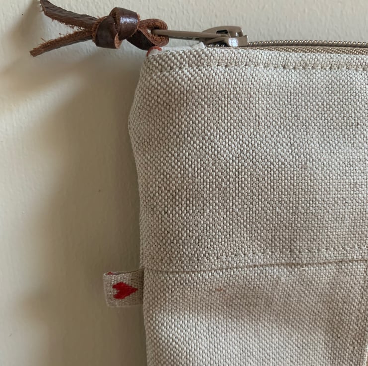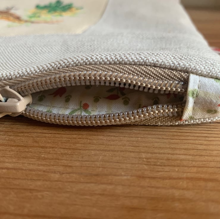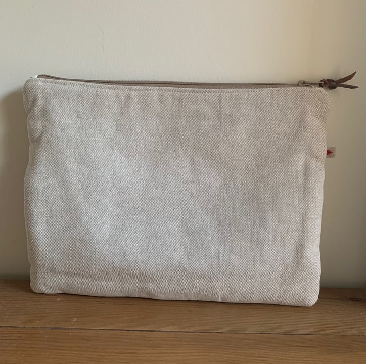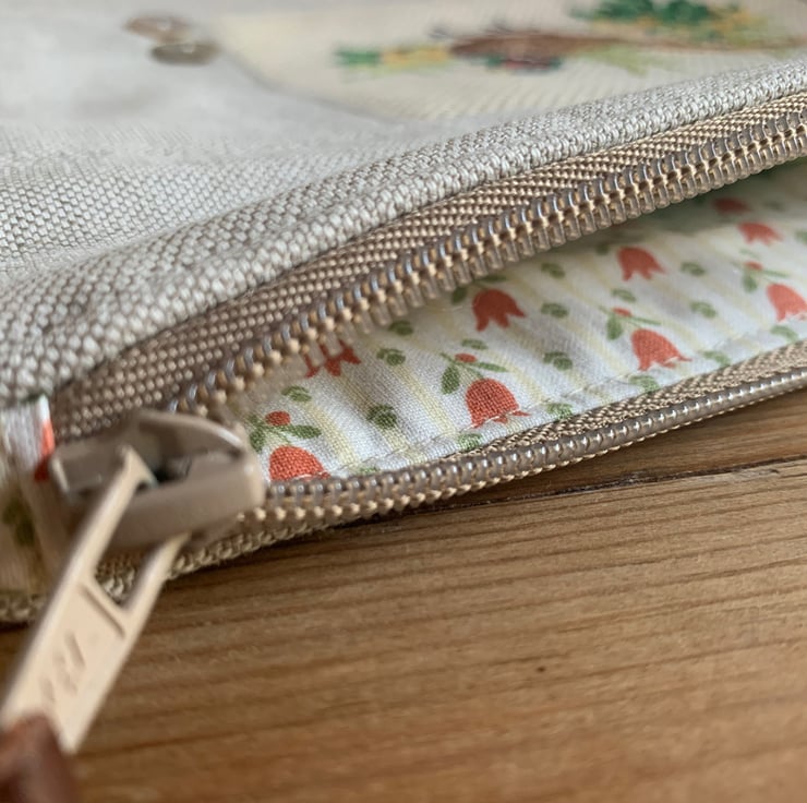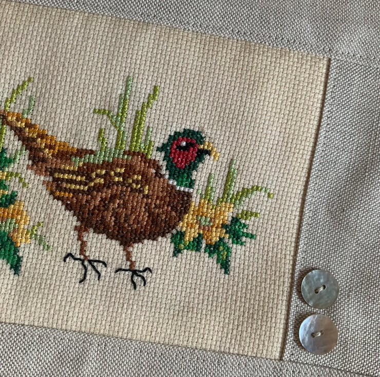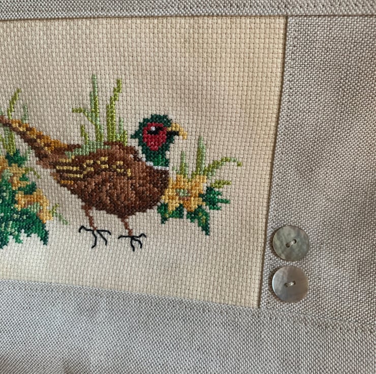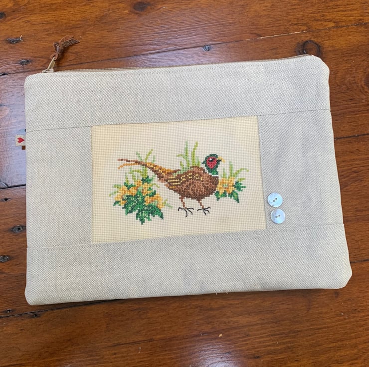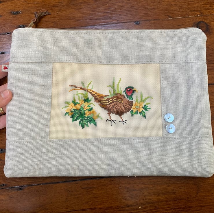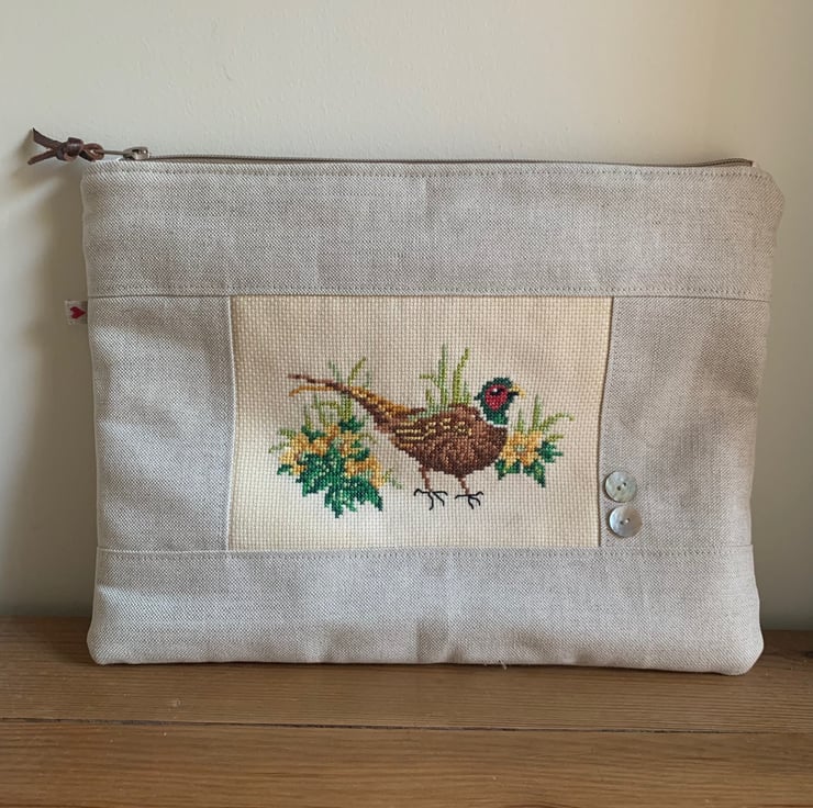 One of a kind large zip pouch in natural linen with a beautiful cross stitched pheasant panel. The pouch is fully lined with vintage Laura Ashley cotton. A layer of interfacing gives some protection to the contents. It is finished with mother of pearl buttons.