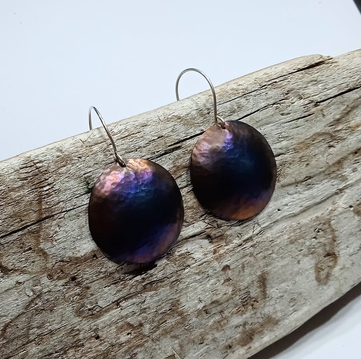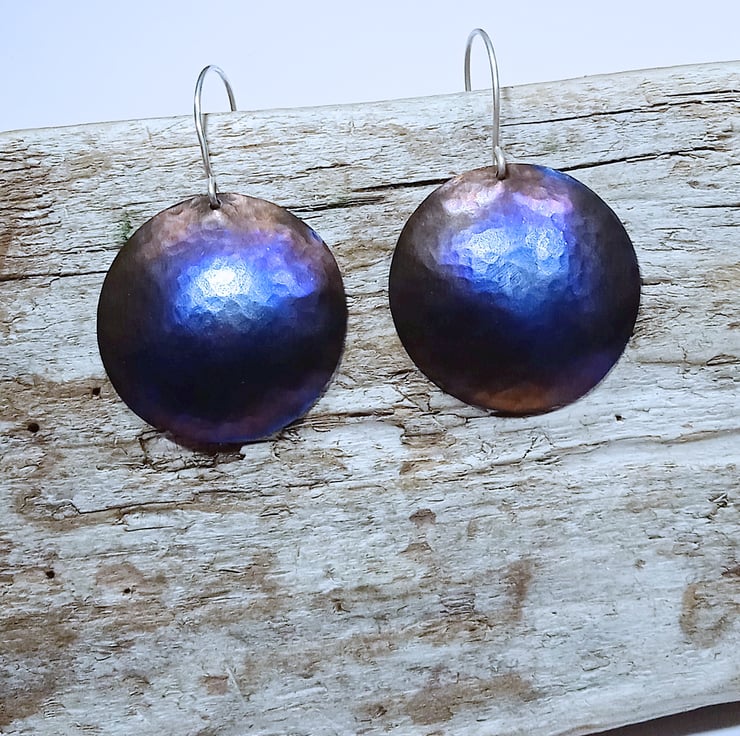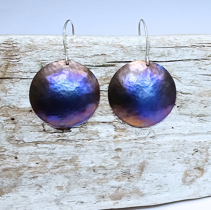 They have been hand sawed from titanium sheet and have then been hammer textured and coloured then domed to create an interesting shape.