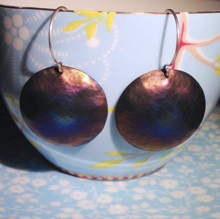 The titanium discs measure approximately 3 cm across and are hung from handmade sterling silver earring wires I have also created. NB. These are also available with handmade titanium earring wires which are shown in the 2nd last photo - please select which option you would prefer at check out.