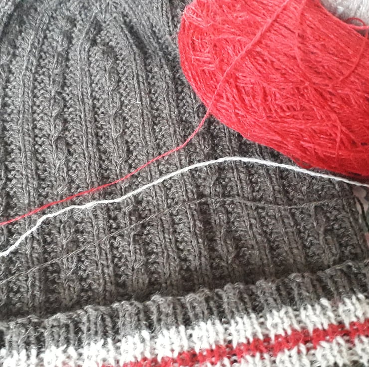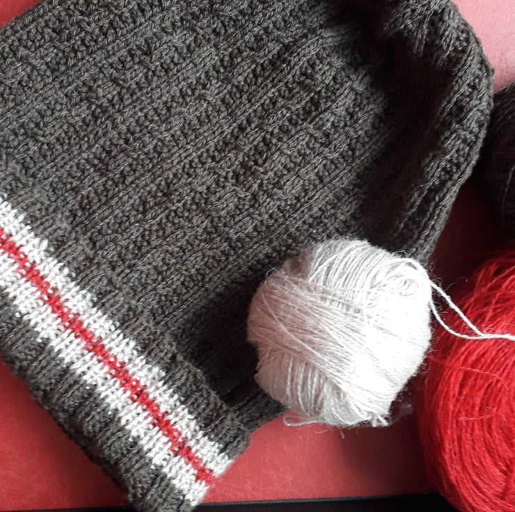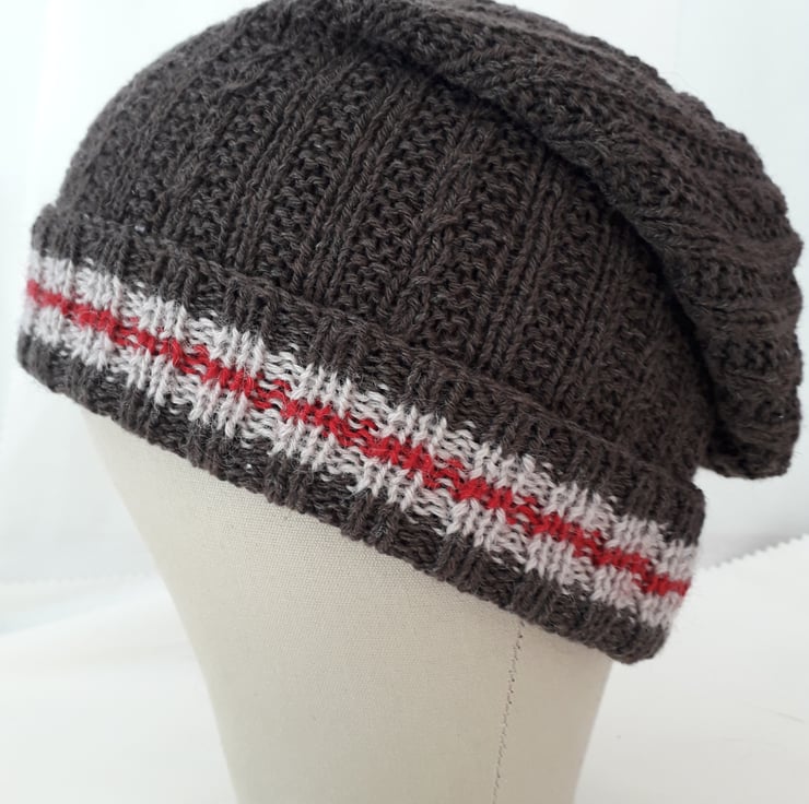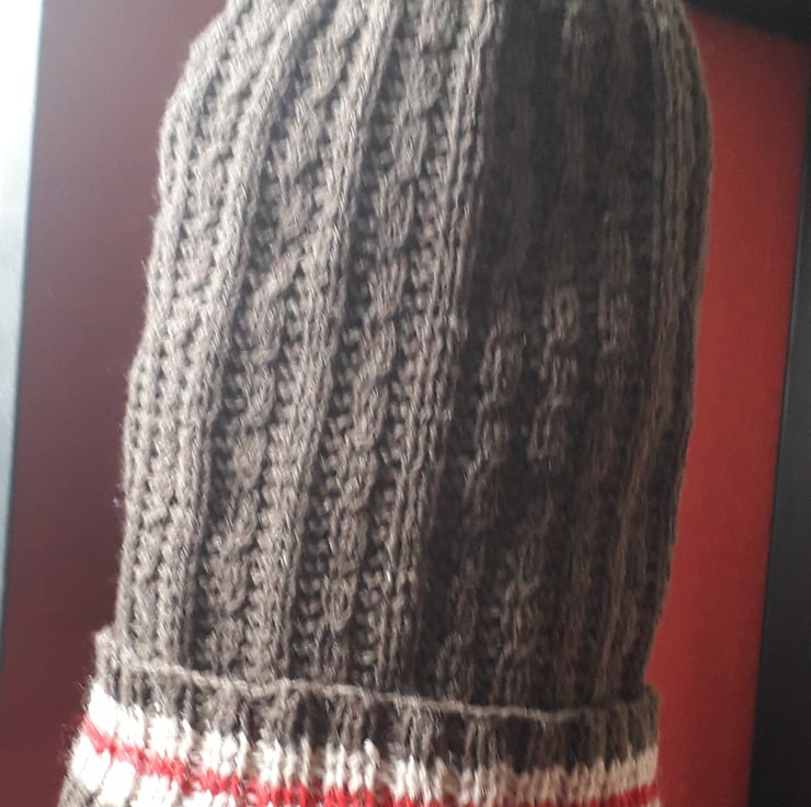 Handknitted woollen hat with fine cables and fold over border with red and white stripe.