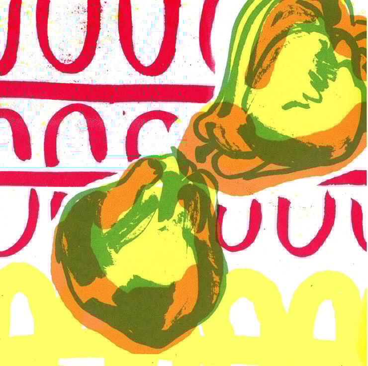 I wanted this quince print to have energy in it. Hard fruits used to be harvested by shaking branches, fruit ready to fall would be caught. Here the quince fall tumbling, straight to the table.