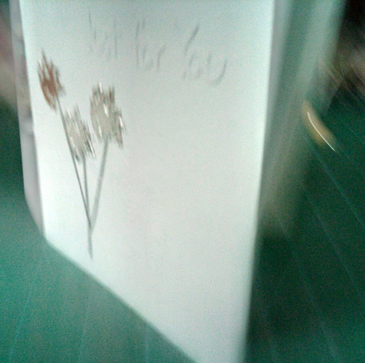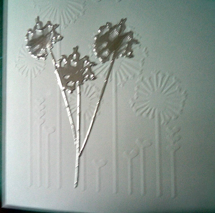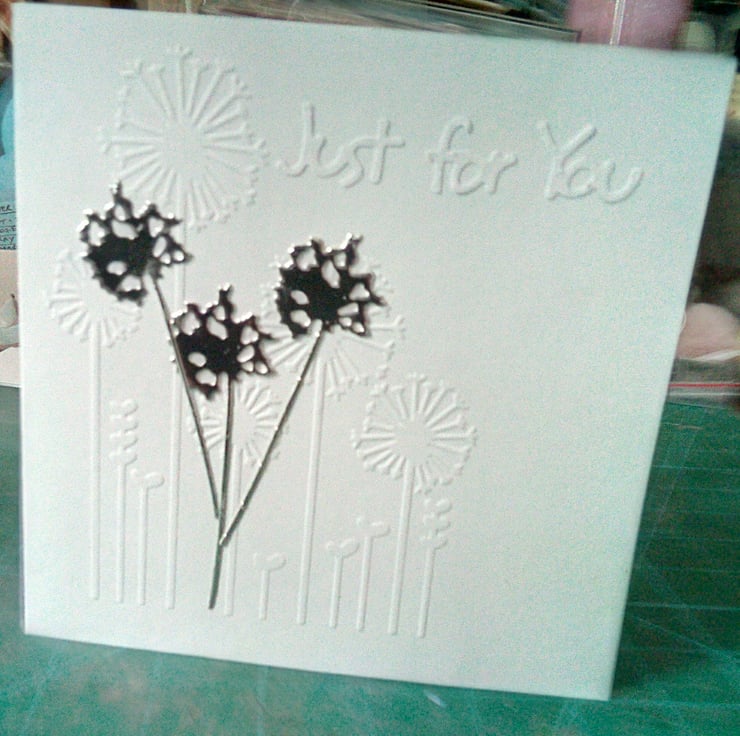 A completely handmade and uniquely designed card. Consisting of dandelion embossed quality pristine white card. Achillea cut from silver card and finished off with just for you cut from white card.