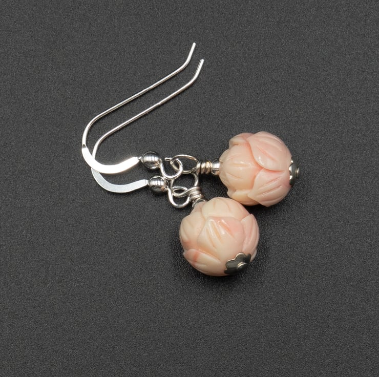 Blush pink 10mm carved shell flowers are mixed with small silver plated spacers for these dainy drop earrings.