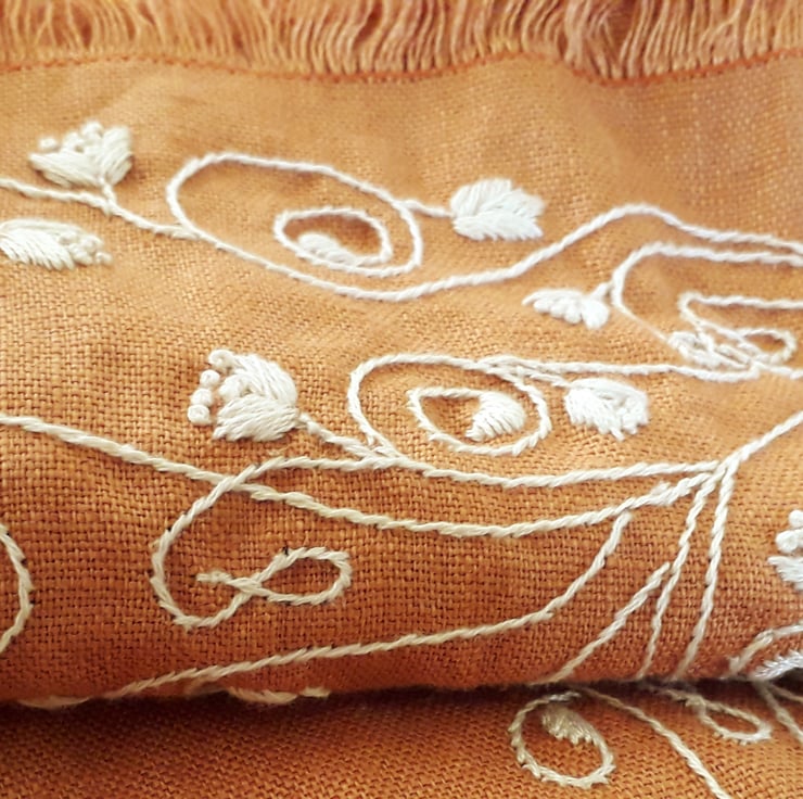 Pure Soft !00% Linen napkins great for daily use. Edged with a fringe and hand embroidered beautifully in off white cotton thread.