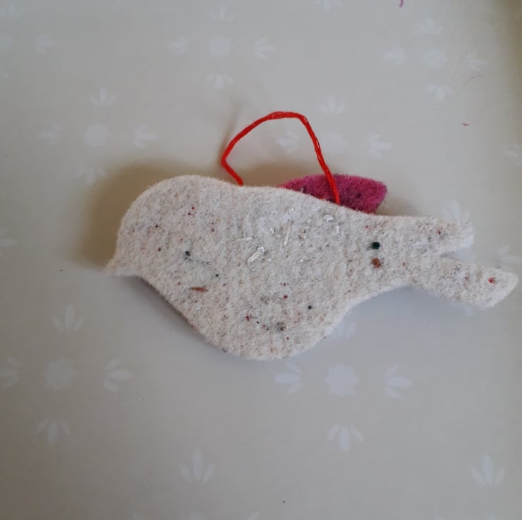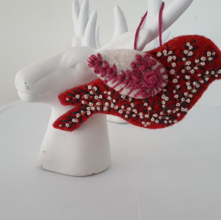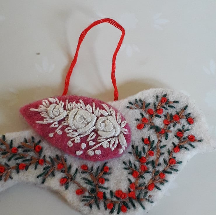 Hand embroidered cute small felt bird with roses and yew twigs.