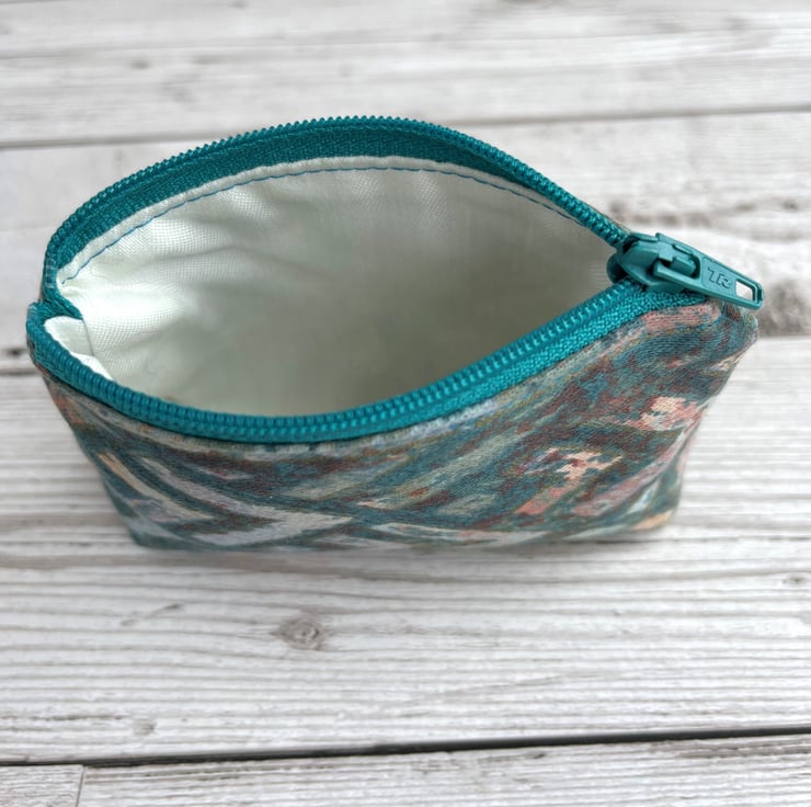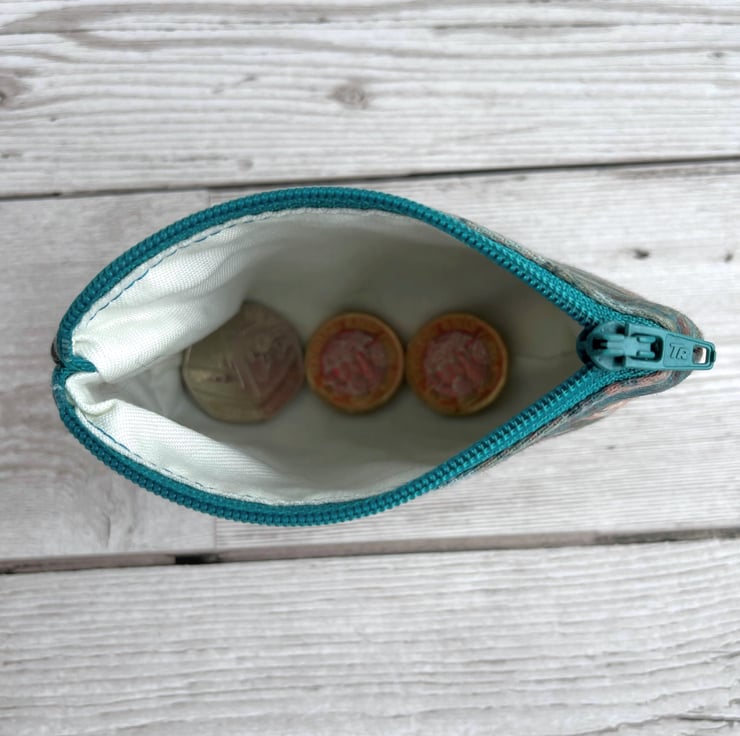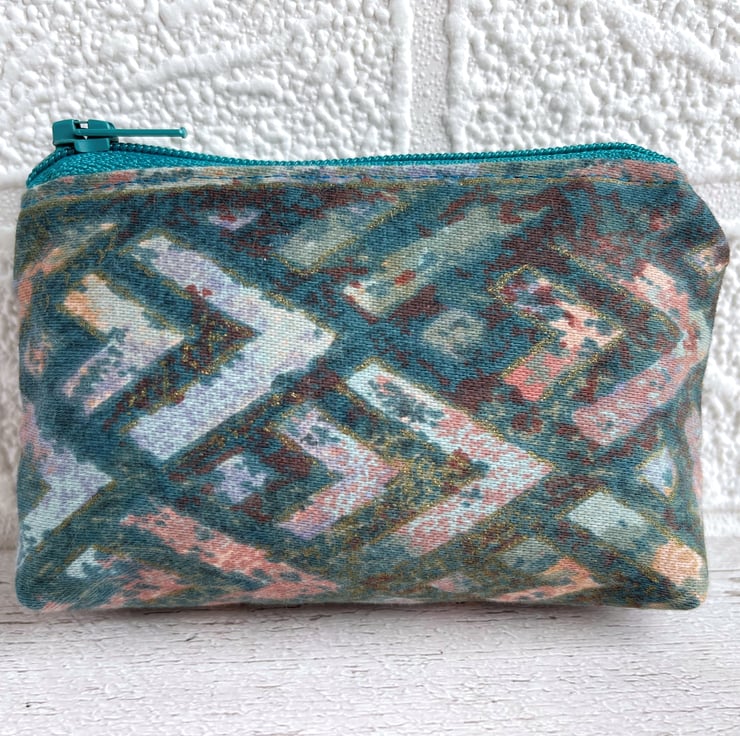 Small coin purse with abstract chevrons pattern. This useful little purse is made from lovely print fabric with an abstract pattern of differently sized chevrons and speckled colours. The background is mostly jade green with highlights of gold. The chevrons are mostly pale blue and salmon pink, speckled with lilac, jade green and darker salmon pink. The coin purse has a matching jade green zip and is lined with cream fabric. The base of the purse is boxed giving extra room inside.
