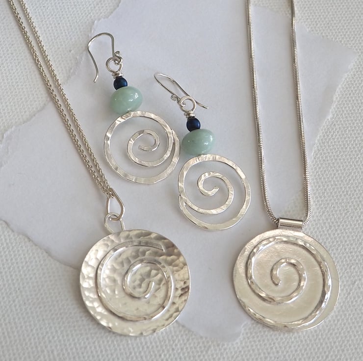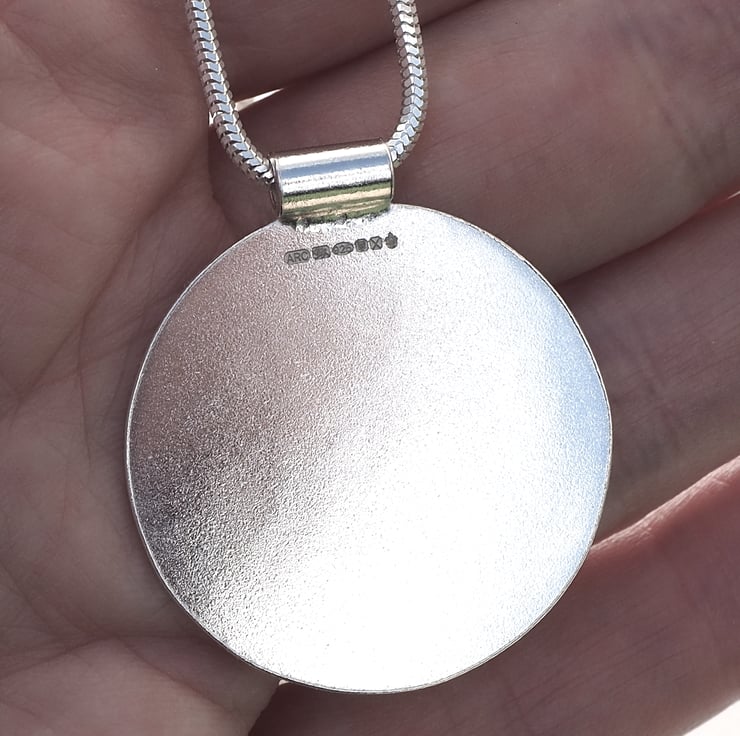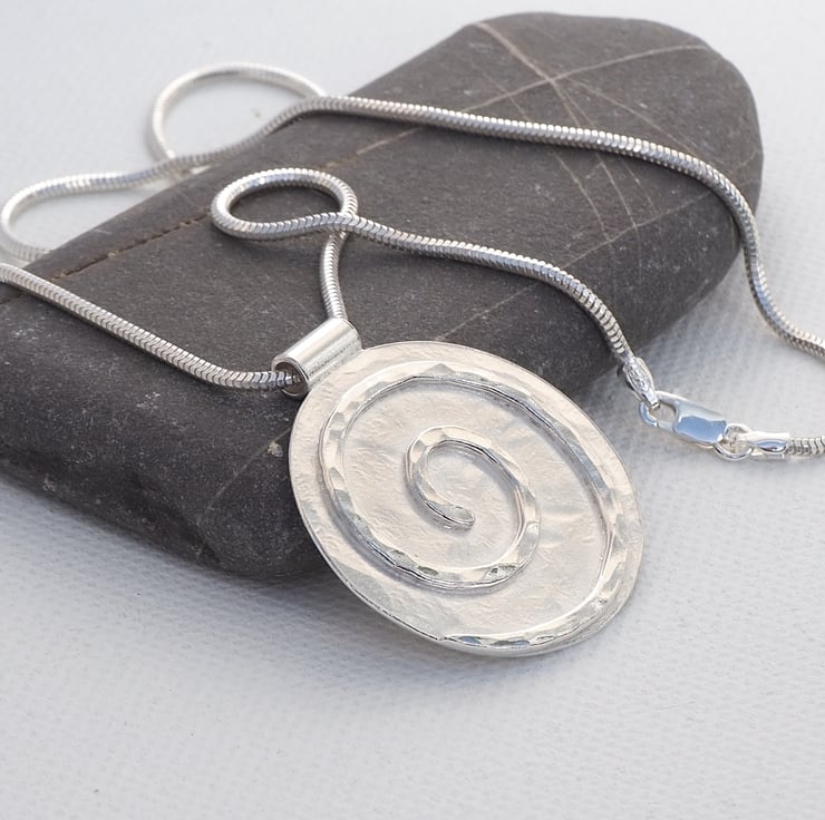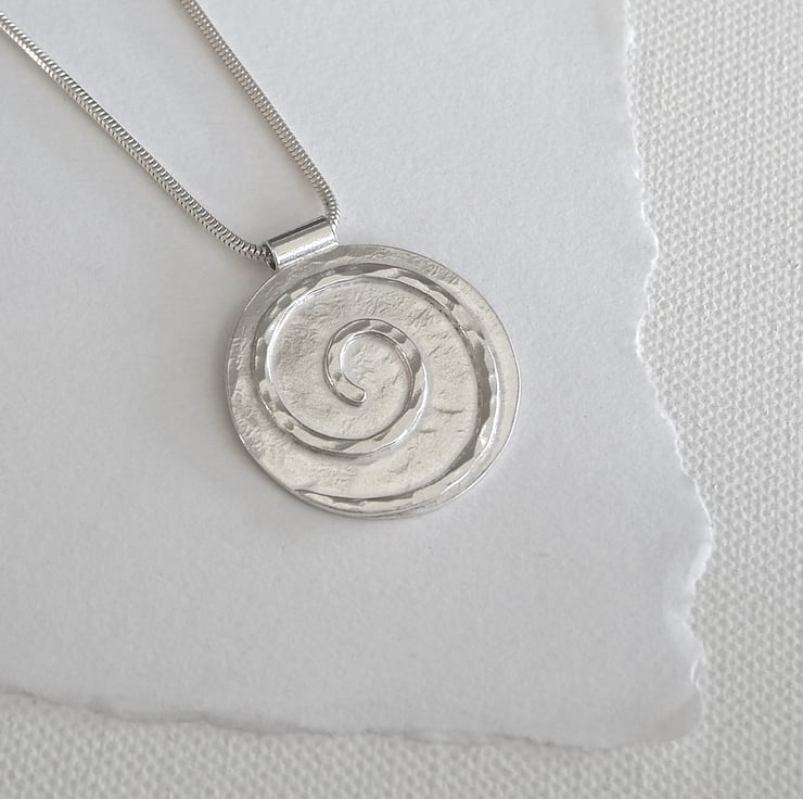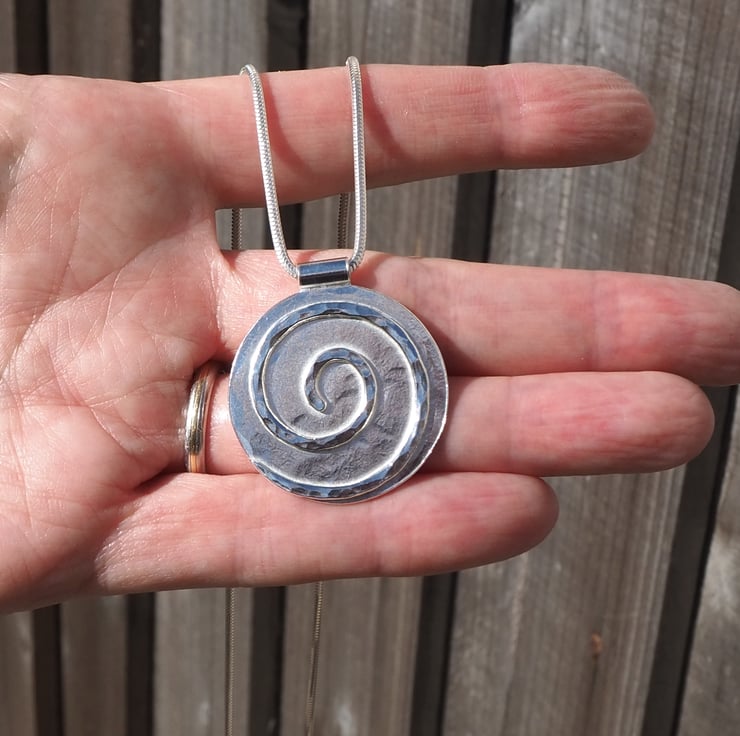 This lovely large spiral disc pendant is handmade from sterling silver 925. The spiral has been fused to the disc and hammered to give a pretty sparkly texture. The disc also has some light hammering to add texture.