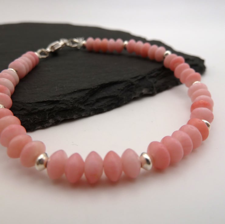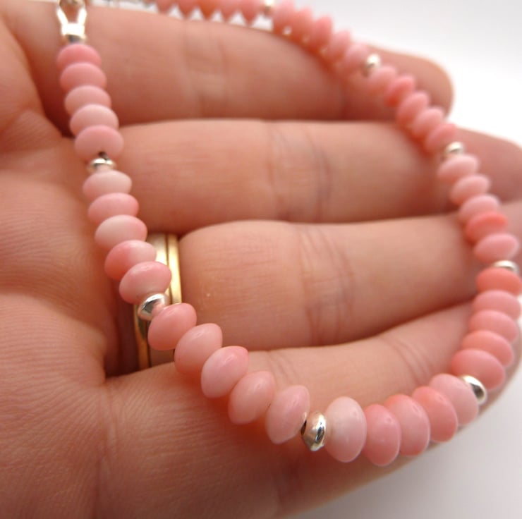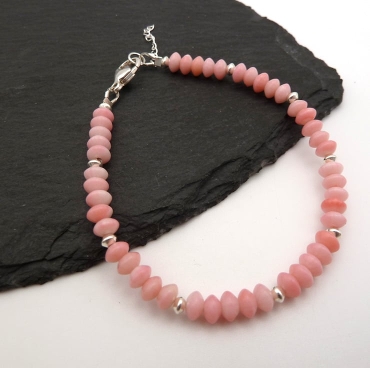 A bracelet made using pink bomboo coral gemstone beads strung with sterling silver beads. It fastens with a sterling silver lobster clasp and extension chain.