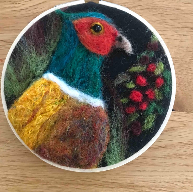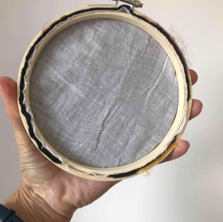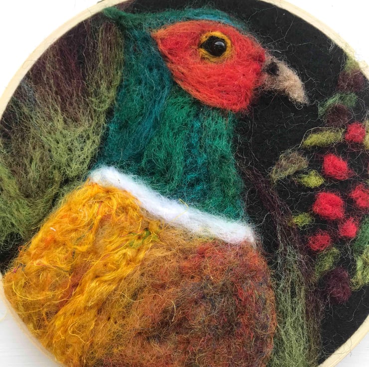 In a 5 and a half inch bamboo embroidery hoop .Black felt background . Backed with cotton muslin.Bead eye