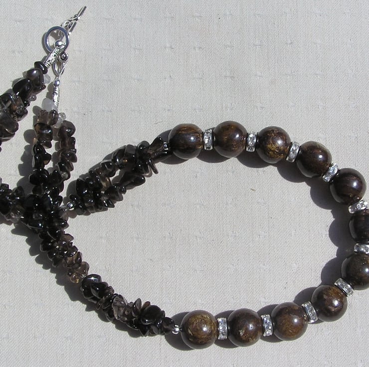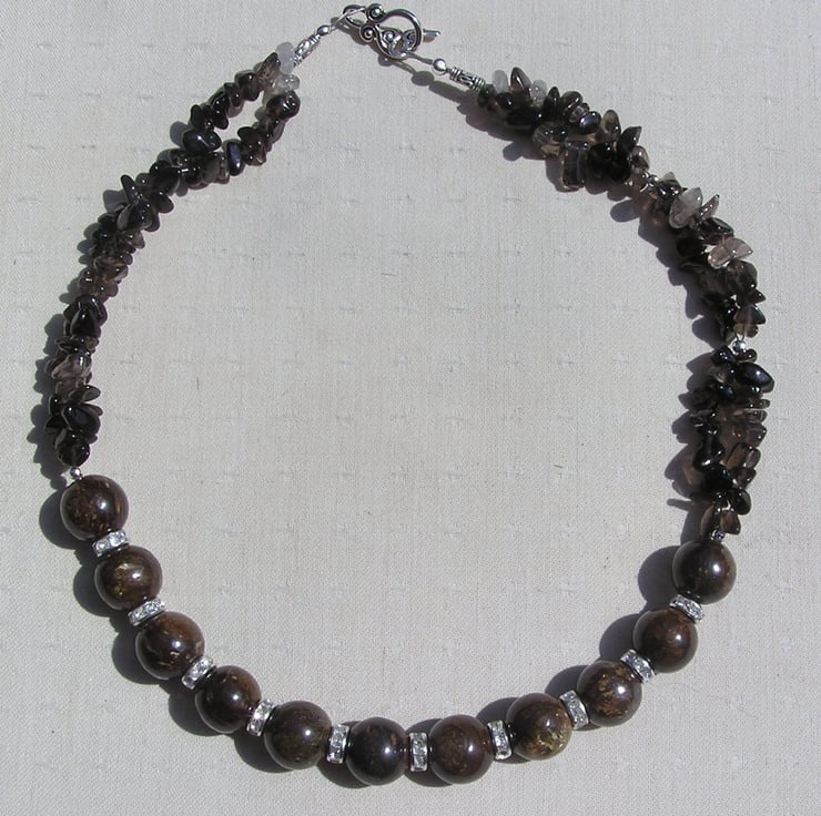 The Central Swathe of this Gorgeous Crystal Gemstone Necklace is made from Chunky Brown Bronzite large round beads each separated by a Glistening Crystal studded spacer which then flow into double-stranded Smoky Quartz Gem-chips - a rich warming combination that will look stunning either worn casually or with something more Elegant for a Special Evening out
