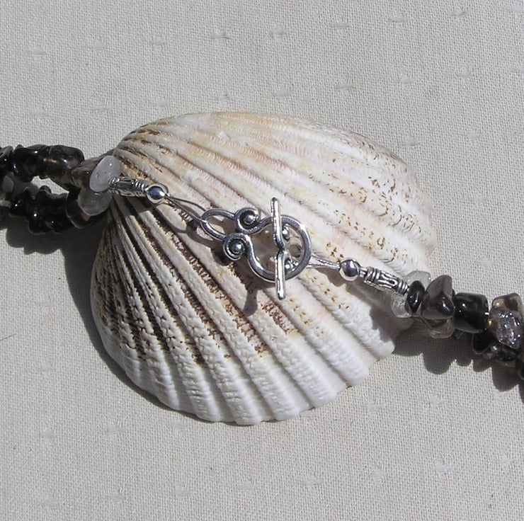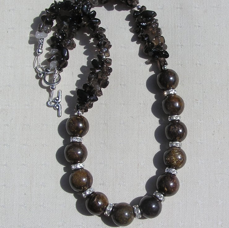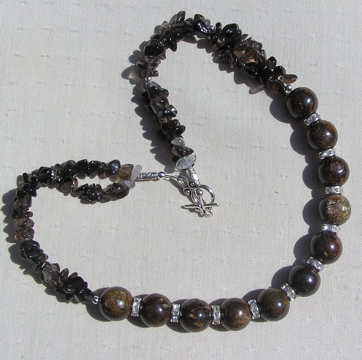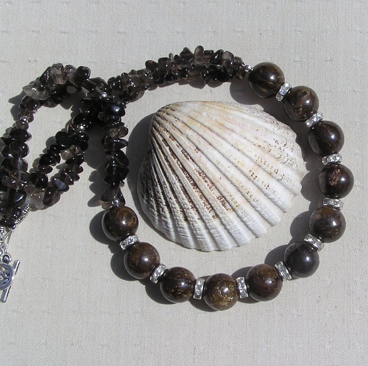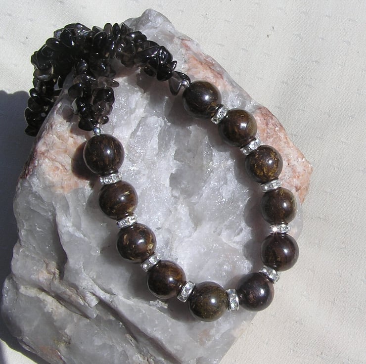 Bronzite & Smoky Quartz Crystal Gemstone Chunky Statement Necklace