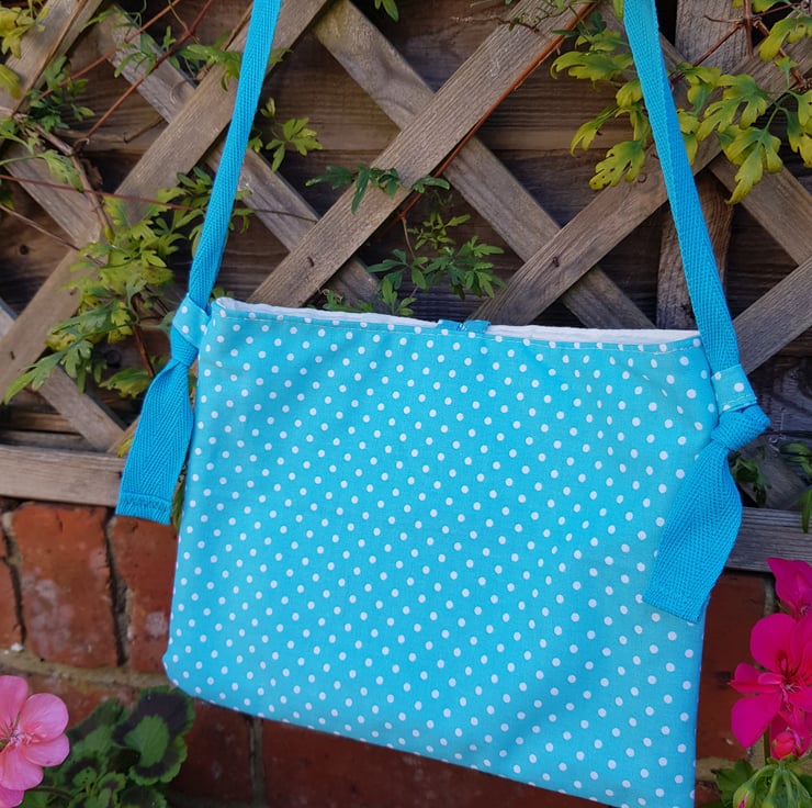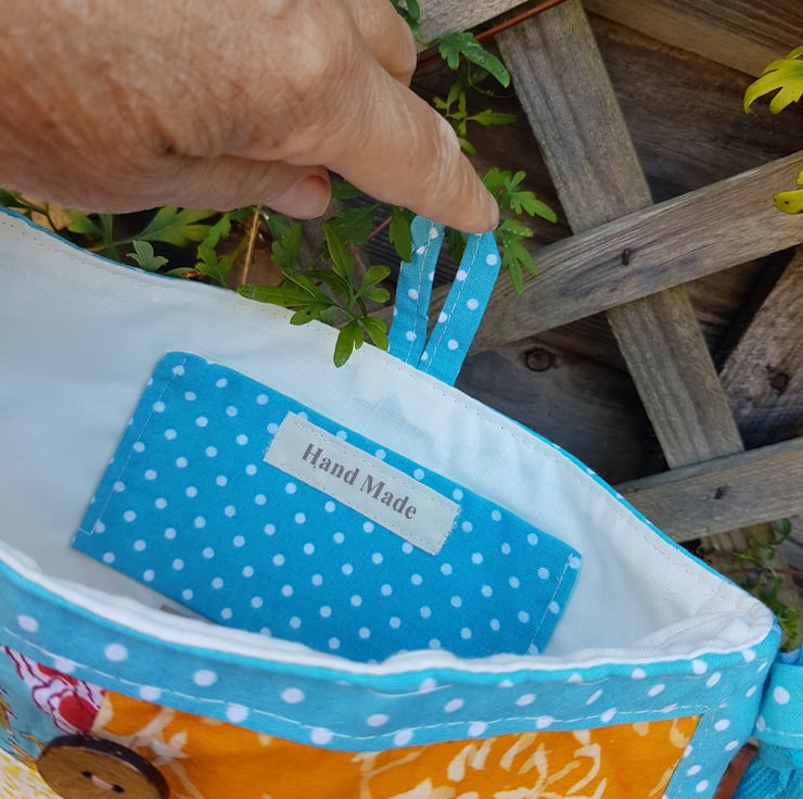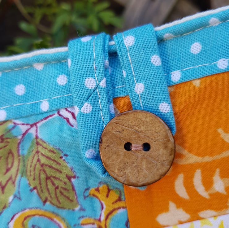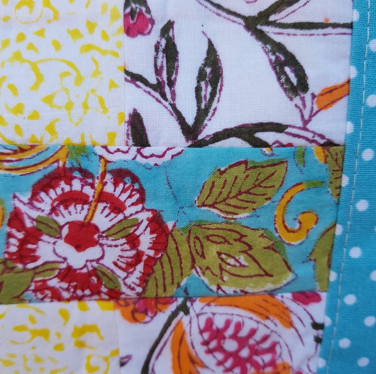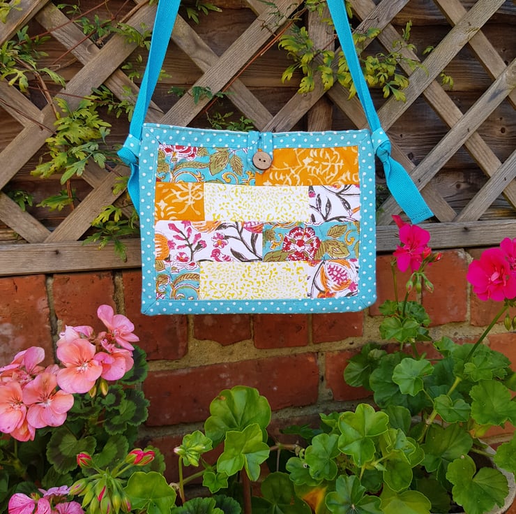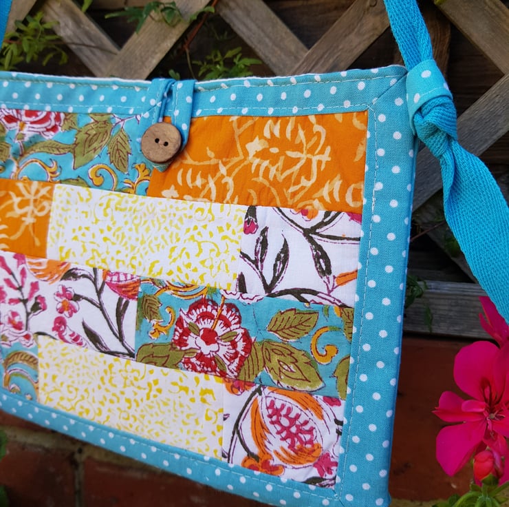 The patchwork on this bag is made from Indian block print fabrics. The patchwork panel is framed by turquoise polka dot cotton. The bag is lined with a cream cotton and there is a small inside pocket.