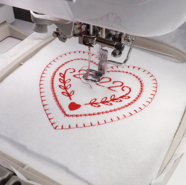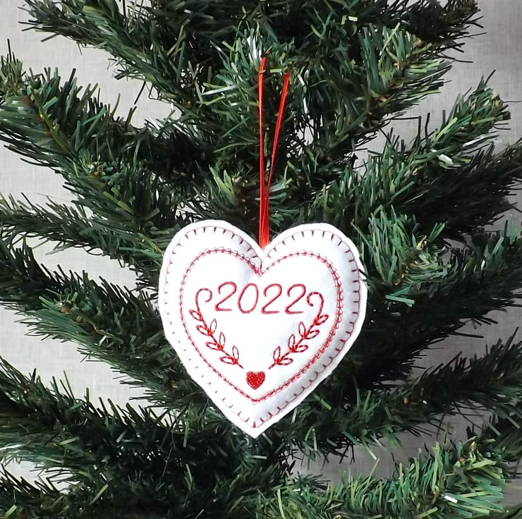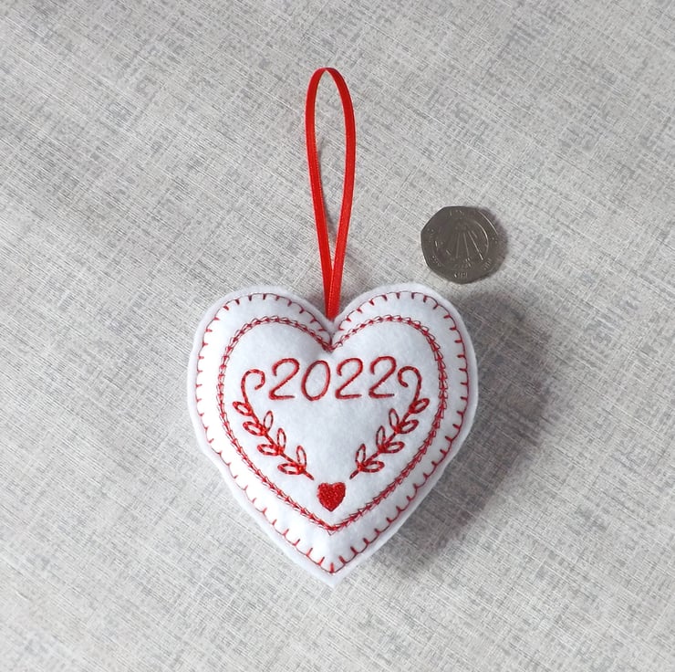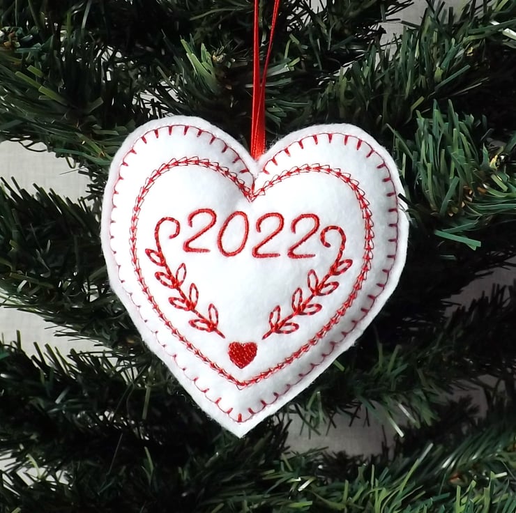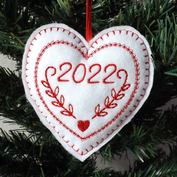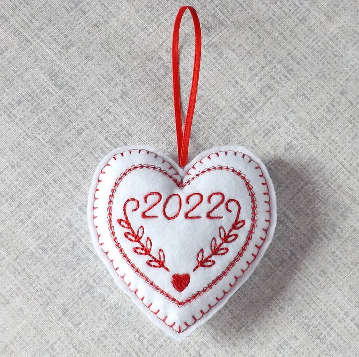 Embroidered on the front with a floral and heart design with 2022 in the centre, using rayon embroidery threads in red, and stuffed with polyester stuffing.