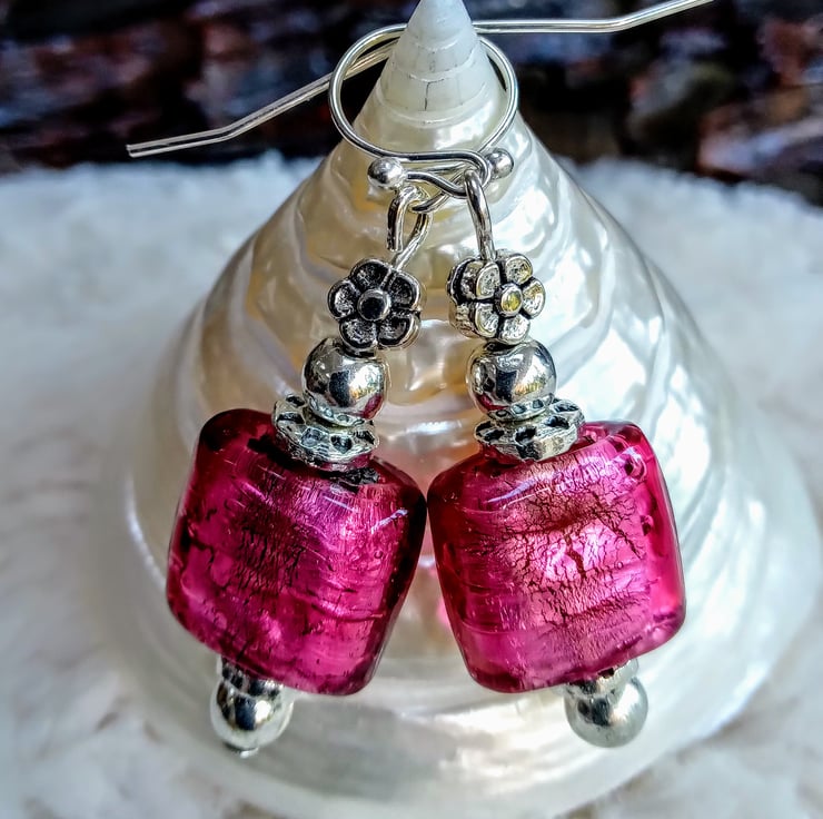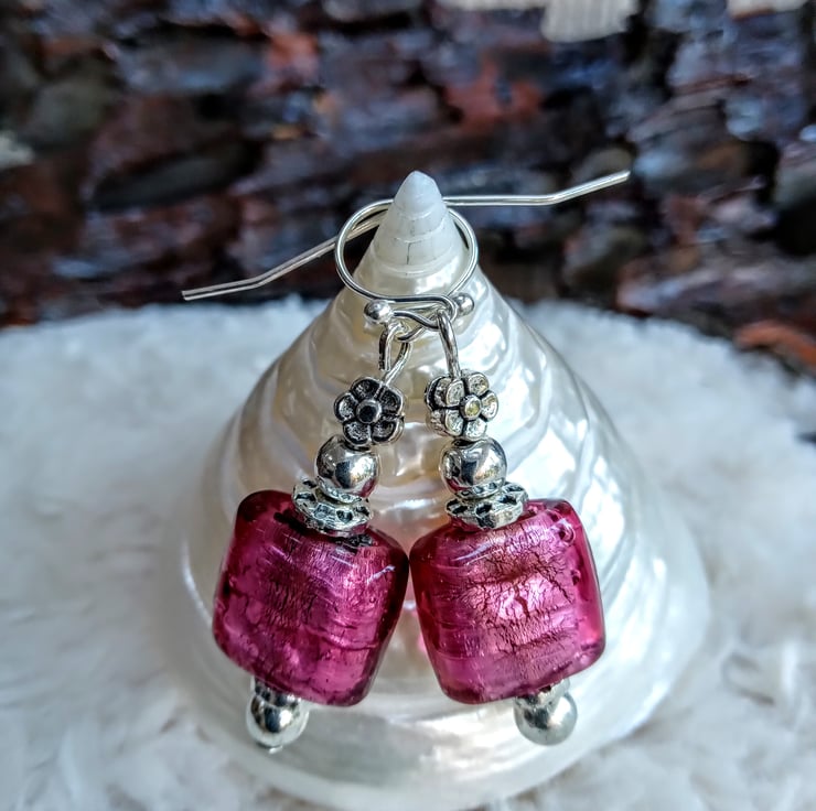 Carefully chosen beautiful pinky-purple silver-foiled square hand-made Lampwork glass beads with Tibetan silver beads on silvertone earwires, these one-off fun earrings are great to wear and good to gift.