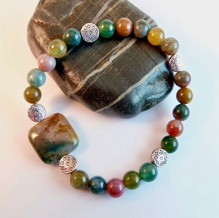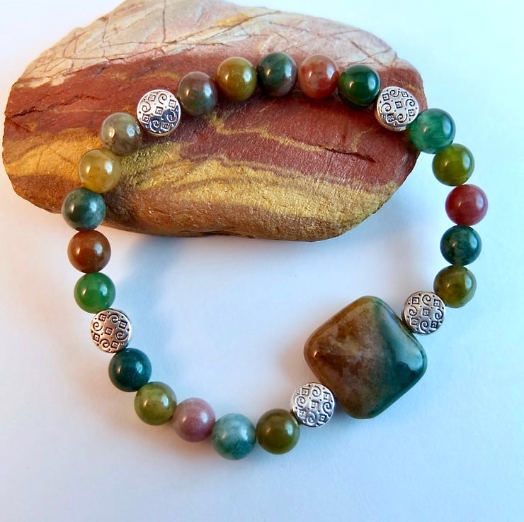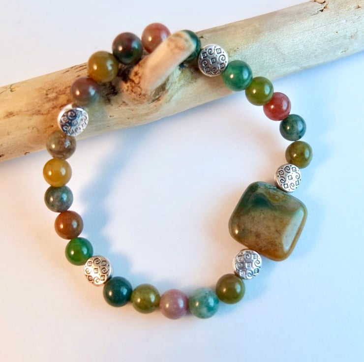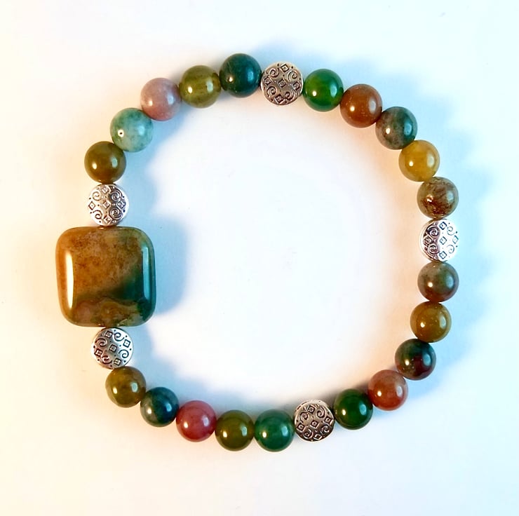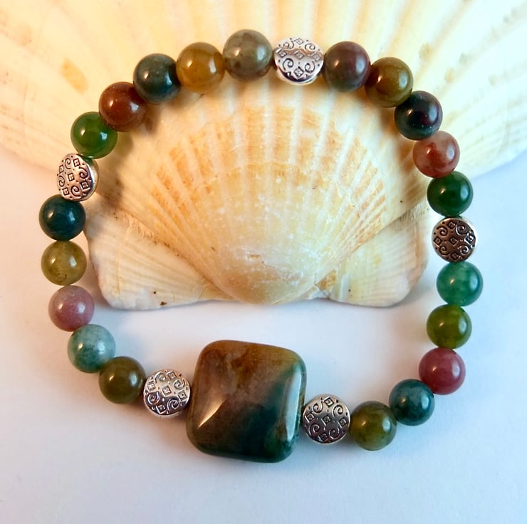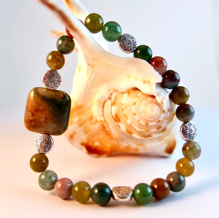 These Fancy Jasper beads show the varied colour palette of this opaque stone - forest greens, rust browns, dusky pinks, amber and mauve.