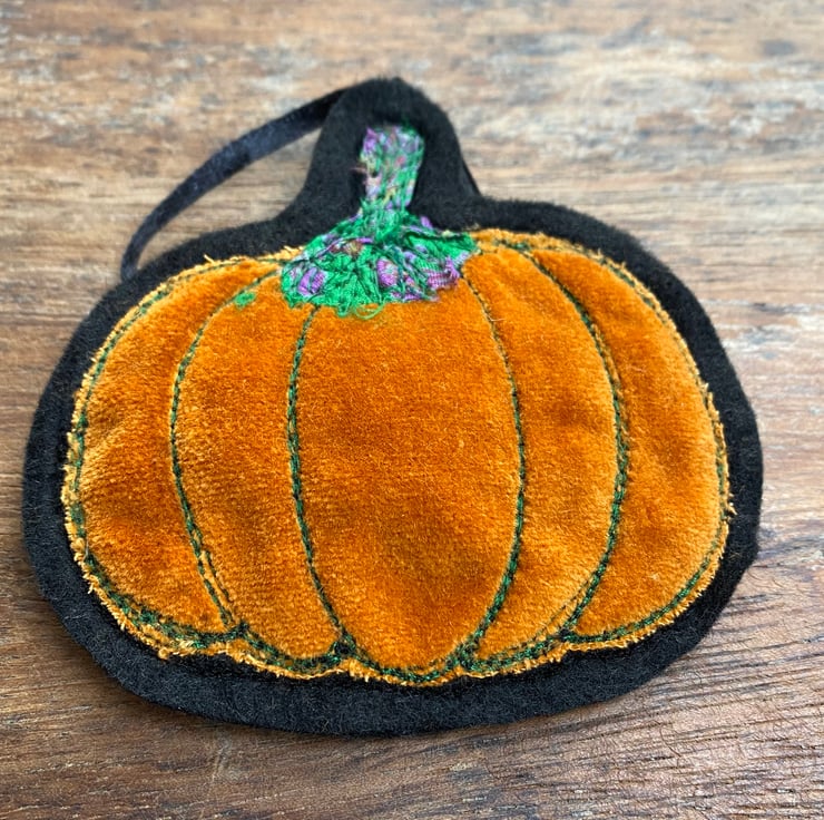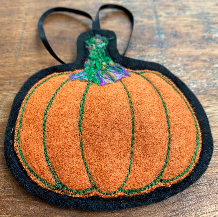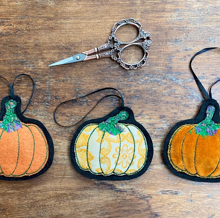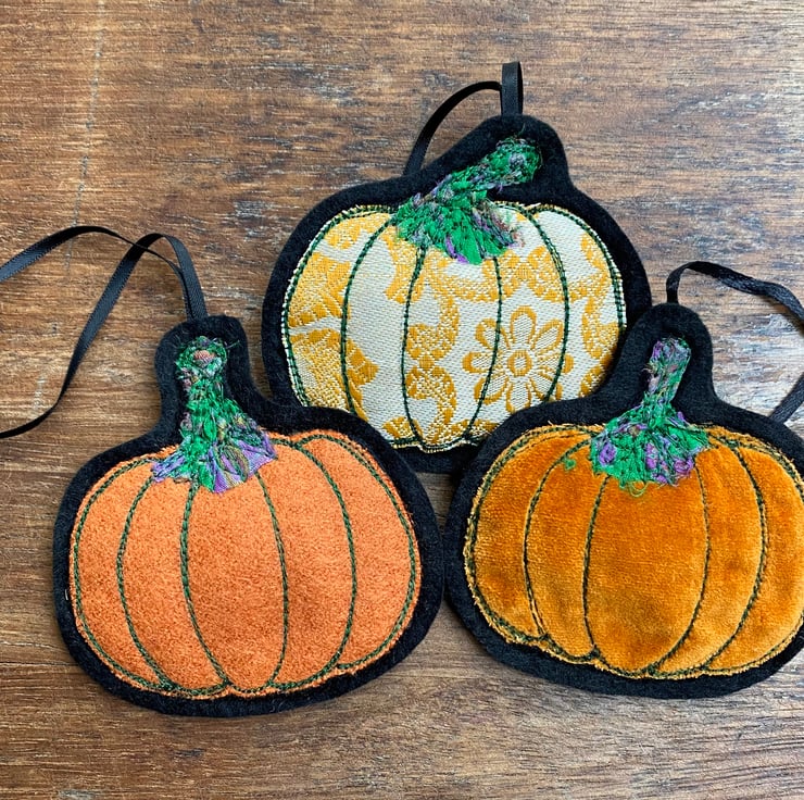 This set of three embroidered pumpkin decorations have been made with up-cycled fabrics and enhanced with free motion embroidery. It’s perfect for the autumn season, Christmas tree decorations, house warming gift or to decorate your home. They come with a matching ribbon and are backed in felt. The each measure 8.5 x 8.5cm approx. With the cord it’s length is 16cm.