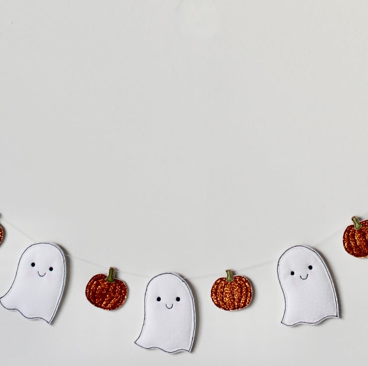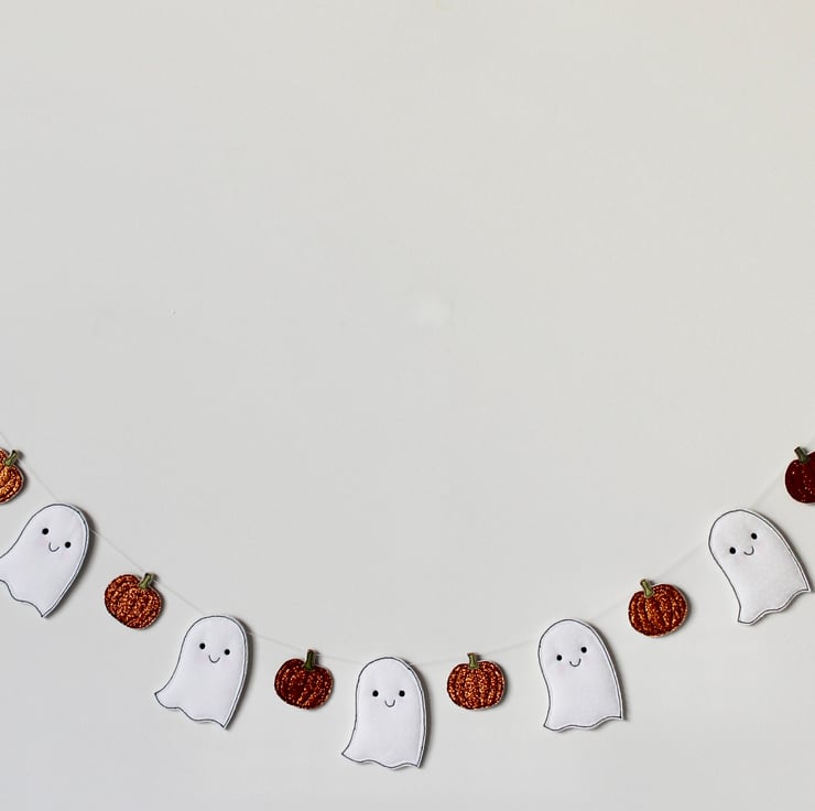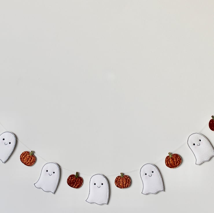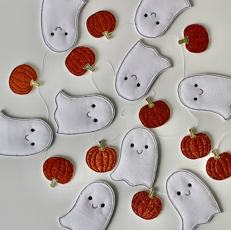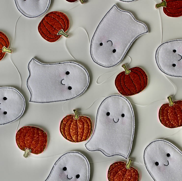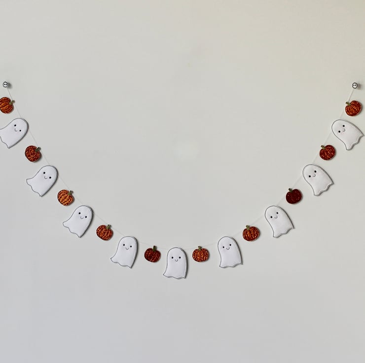 The pumpkins and ghosts are suspended on a linen thread and can be moved along the length allowing a little creativity with spacing.