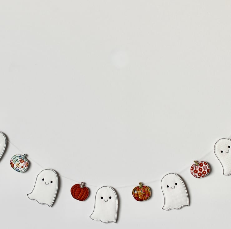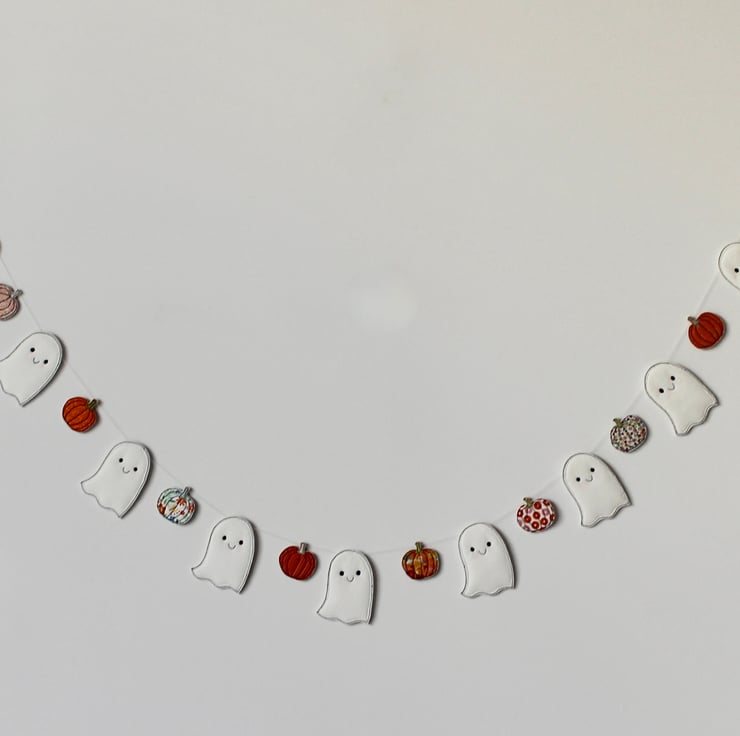 The pumpkins and ghosts are suspended on a linen thread and can be moved along the length allowing a little creativity with spacing.